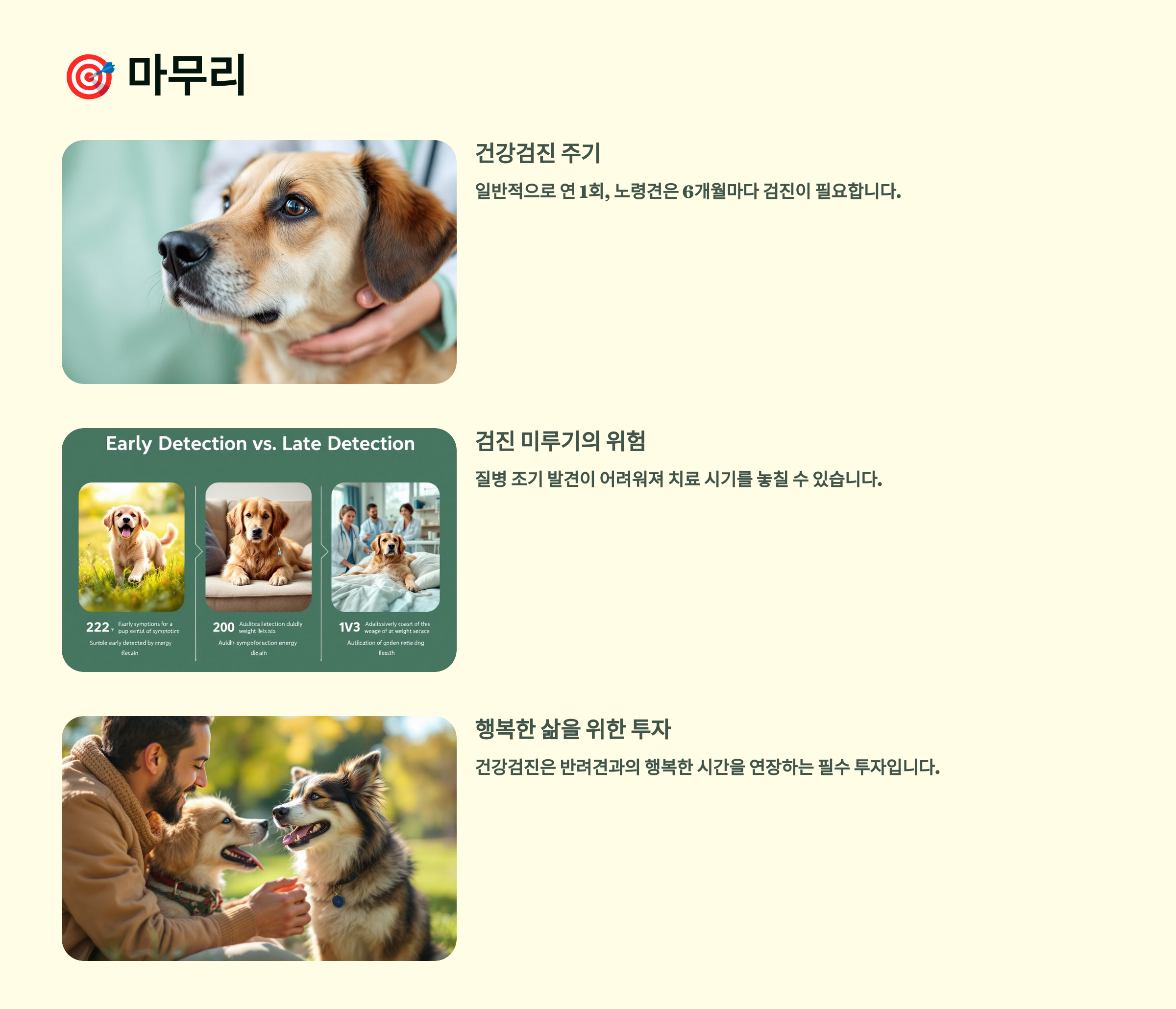 건강검진은 단순히 아픈 곳을 찾는 것이 아니라 평생 건강관리의 출발점이에요. 정기적인 검진을 통해 우리 강아지의 건강 상태를 정확히 파악하고, 필요한 관리를 해준다면 더욱 건강하고 행복한 반려생활을 할 수 있을 거예요. 검진을 고민하고 계신다면 더 이상 미루지 마시고, 우리 강아지에게 맞는 최적의 건강검진 계획을 세워보세요! 🐕💕