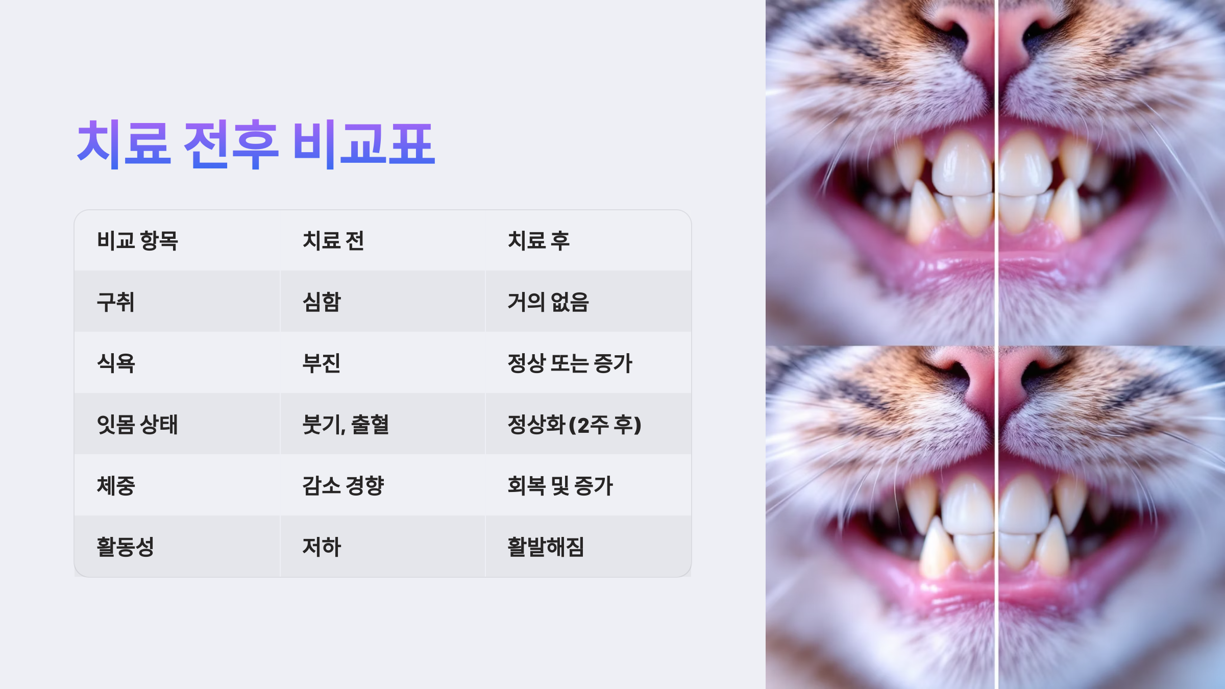 | 구강 냄새 | 심한 악취, 침 흘림 | 냄새 사라짐, 침도 없음 |
