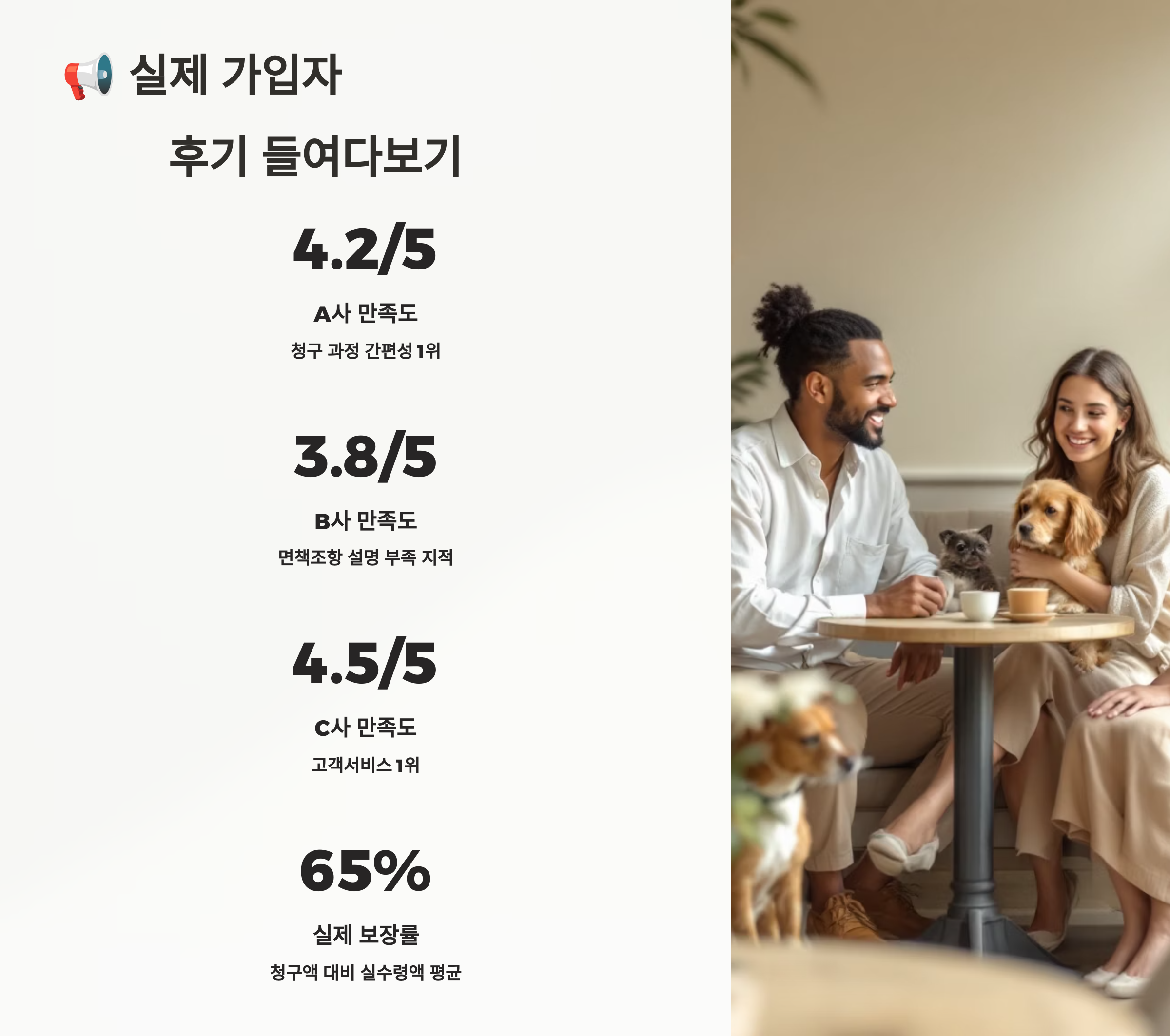 물론 아쉬운 후기도 있어요. 어떤 보호자는 보험금 청구에 시간이 오래 걸렸고, 보장 제외 조항으로 인해 보험금을 받지 못해 불만을 느꼈다고 해요. 그래서 후기들 보면 꼼꼼한 약관 확인이 정말 중요하다는 걸 알 수 있어요.