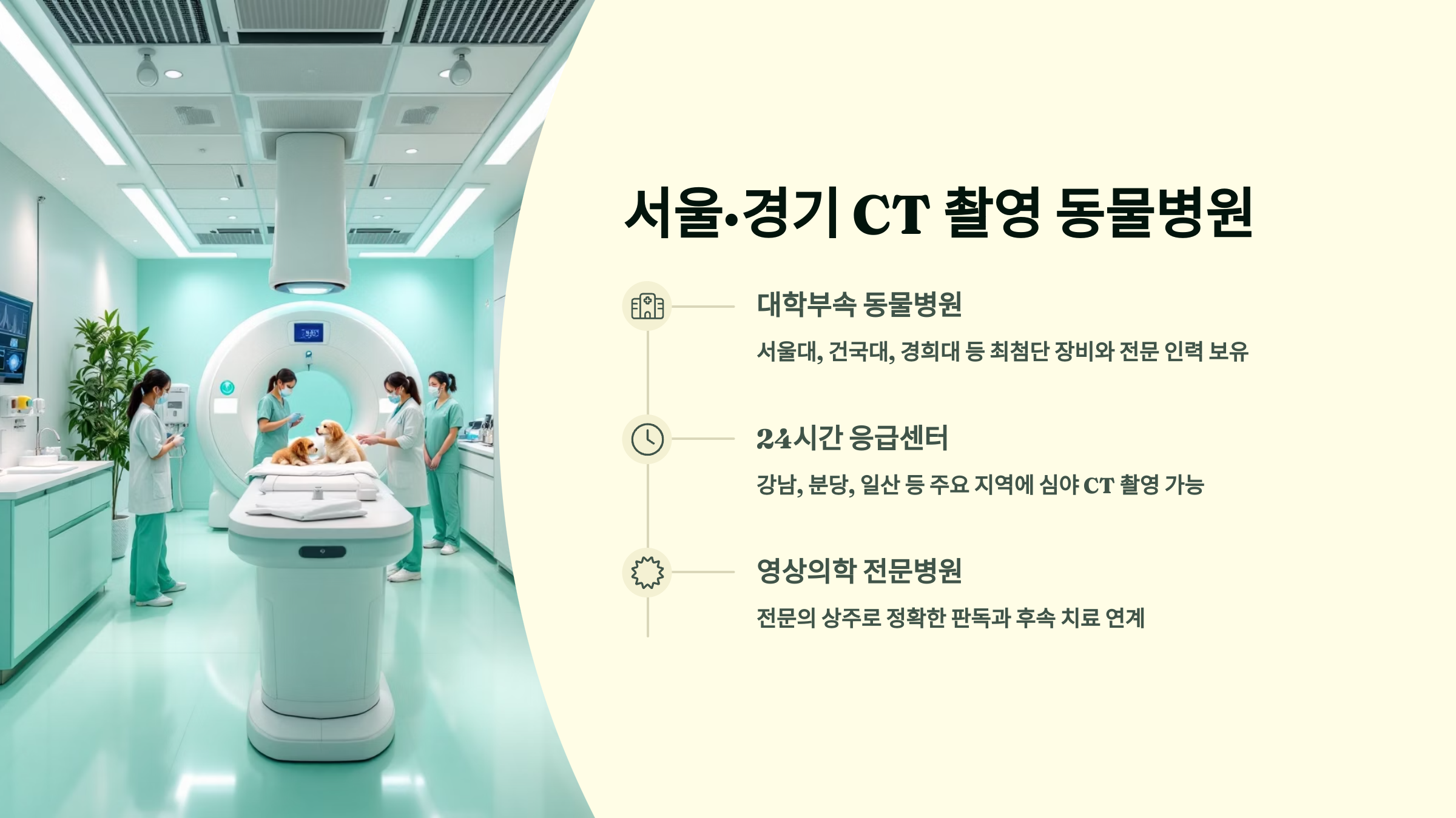 서울과 경기도는 전국에서 가장 많은 동물병원이 밀집한 지역이에요. 특히 대학병원, 특화센터, 24시 응급 병원이 많이 위치해 있어서 CT를 포함한 고급 진단 장비 보유율도 높은 편이에요.