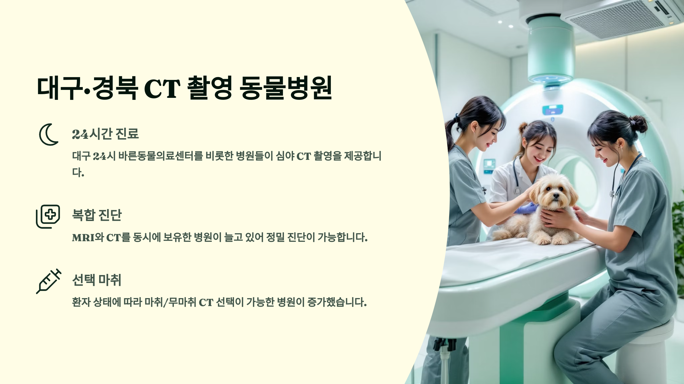 대구와 경북 지역은 CT 장비를 보유한 대형 동물병원이 꾸준히 증가하고 있어요. 특히 대구는 경북대학교 수의과대학 부속 동물병원이 대표적이며, 민간 2차 병원들도 정밀 검사를 위한 장비를 많이 도입하고 있어요.