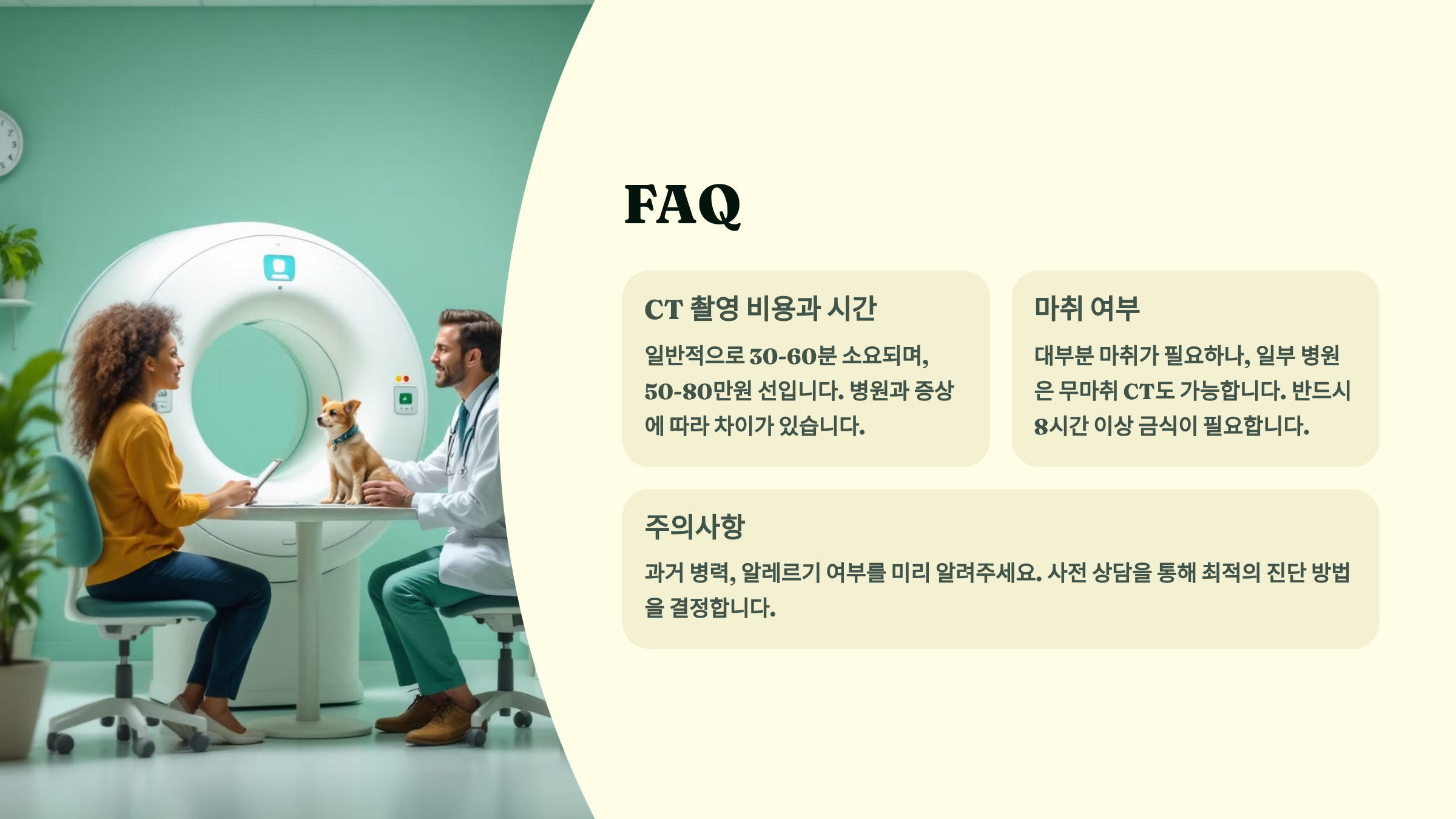 반려동물 CT는 보통 전신마취 후 촬영이 필요하기 때문에 검사 전후 컨디션 확인, 사전 상담이 중요해요. 마취가 어려운 고령견이나 심장질환이 있는 아이는 촬영 여부를 수의사와 신중히 결정해야 해요.