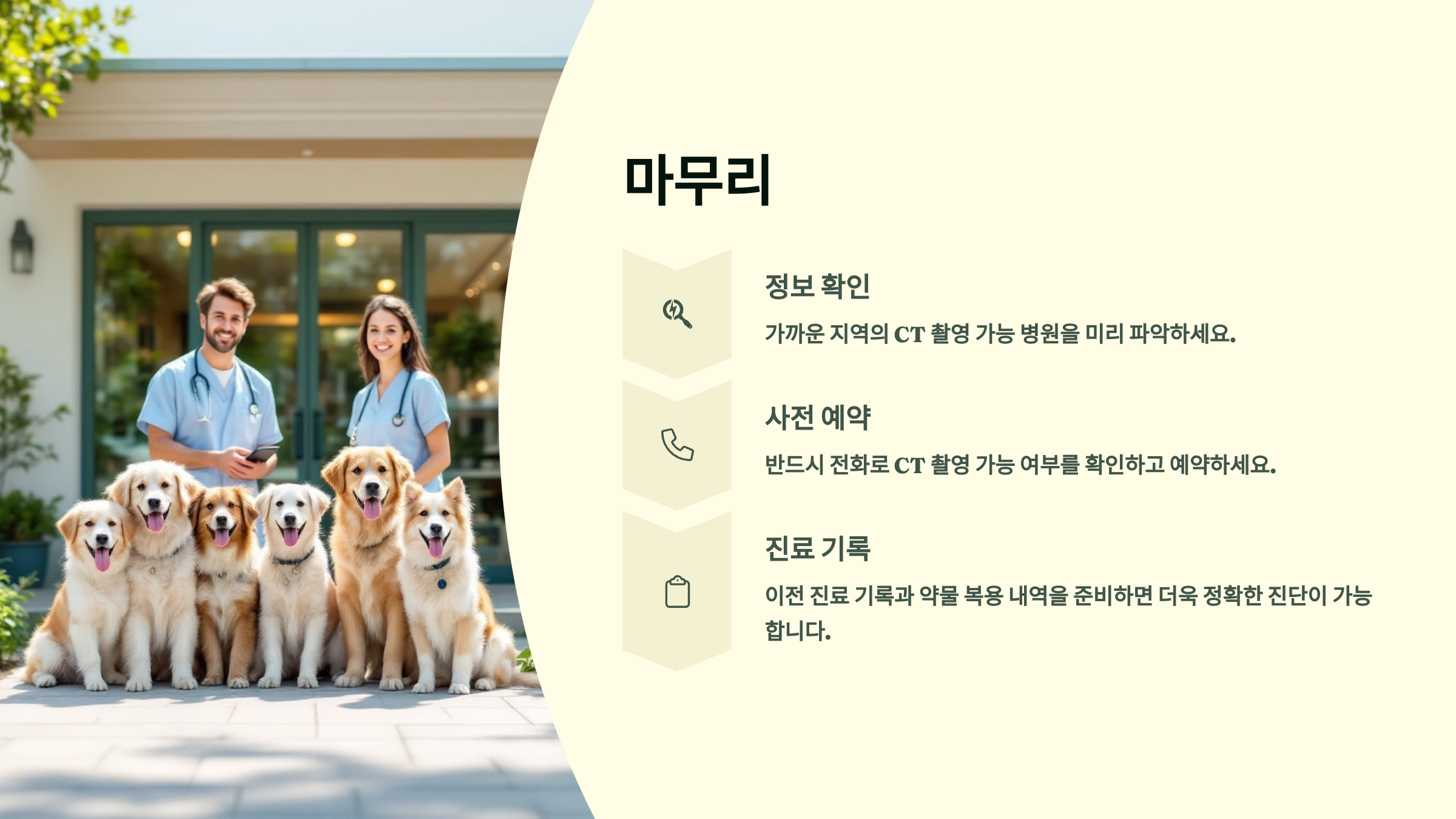 제가 생각했을 때 가장 중요한 건 사전에 지역별 CT 가능 병원을 알아두는 것이에요. 반려동물의 갑작스러운 증상으로 병원을 급히 찾는 순간, 정보가 없다면 오히려 더 위험할 수 있어요.
