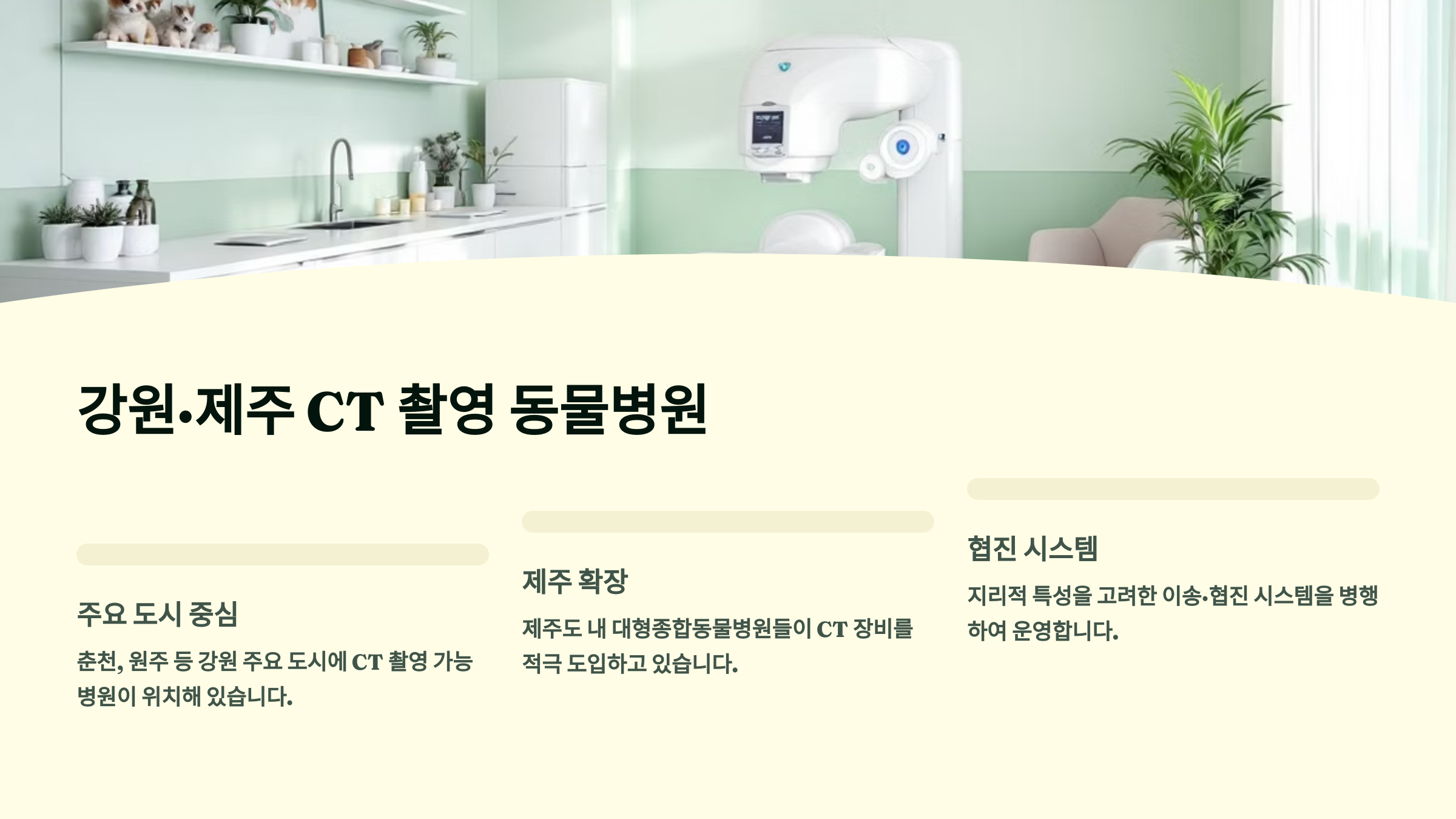 아래는 강원도와 제주도에서 CT 촬영이 가능한 주요 동물병원의 정보를 표로 정리한 내용입니다. 지역별 의료 접근성을 비교해보시길 바랍니다.