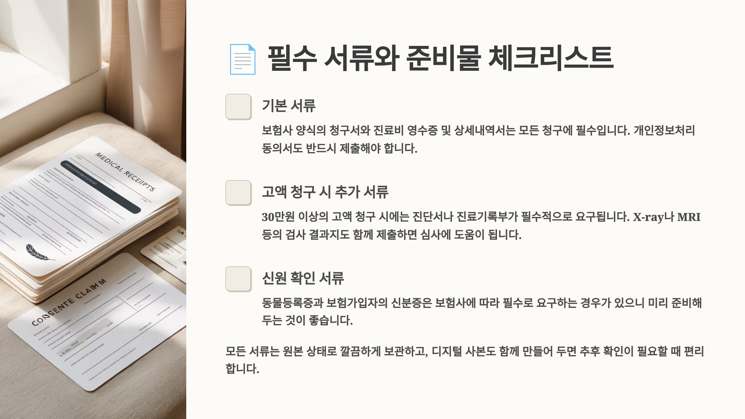 진료기록부(의무기록사본)도 중요한 서류예요. 🏥 수의사가 작성한 진단명, 증상, 치료 내용이 상세히 기록되어 있어야 해요. 특히 큰 수술이나 장기 치료의 경우 필수예요. 일부 병원은 진료기록부 발급에 수수료를 받기도 하는데, 보통 5천원-1만원 정도예요. 미리 준비하면 보험금으로 충분히 보상받을 수 있으니 아끼지 마세요.