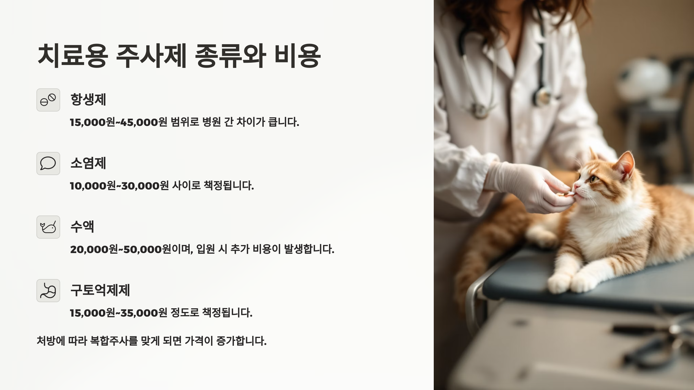 치료용 주사제는 반려동물이 아플 때 사용하는 약물로, 종류가 매우 다양해요. 가장 많이 사용되는 항생제 주사의 경우, 페니실린 계열은 비교적 저렴해서 1회 접종에 5천-1만원 정도예요. 하지만 세팔로스포린이나 플루오로퀴놀론 같은 고급 항생제는 1회에 2-5만원까지도 나가요. 특히 내성균 감염이나 중증 감염의 경우 사용하는 카바페넴 계열 항생제는 1회 접종에 10-20만원에 이르기도 해요.