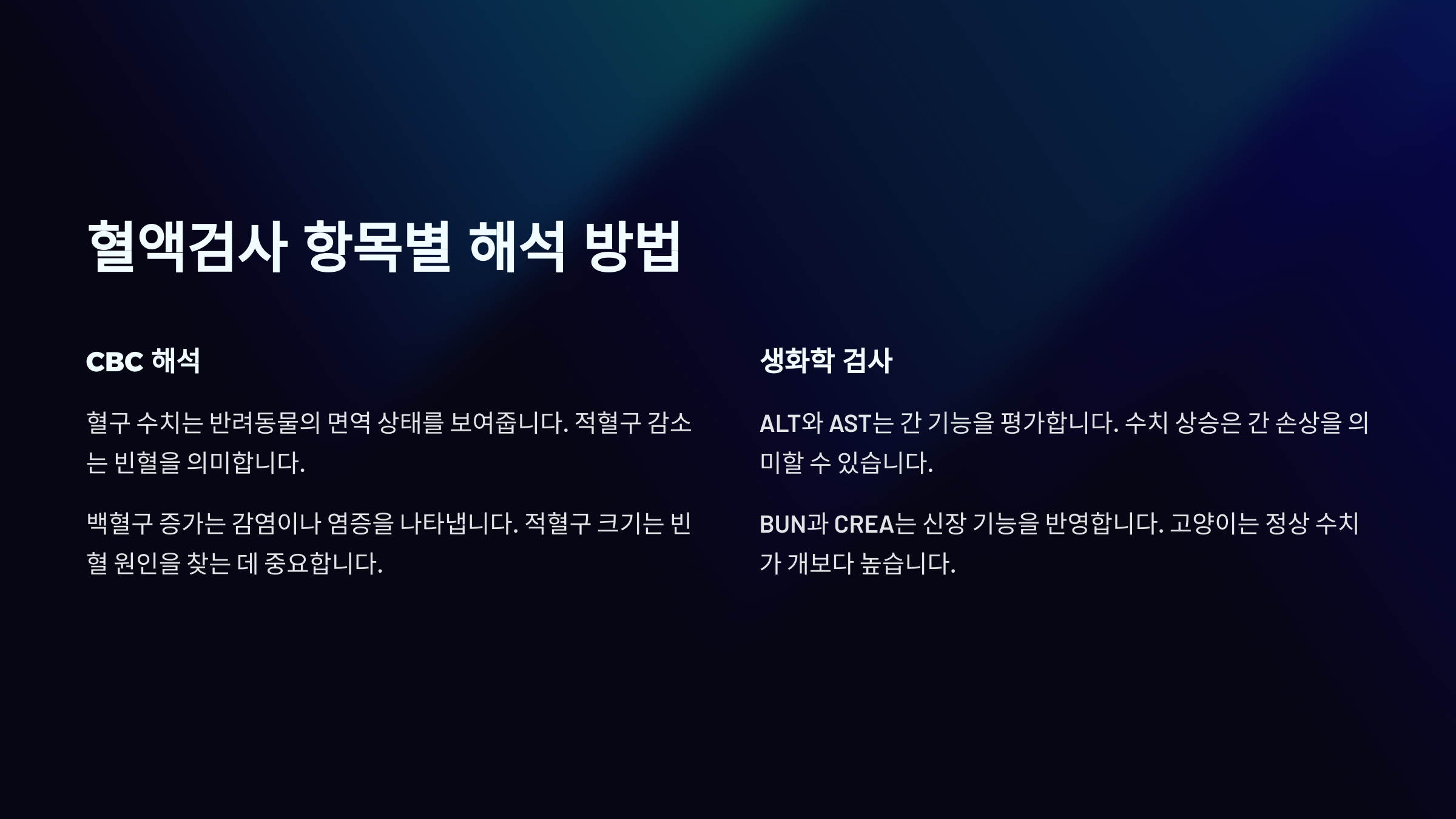 | 검사 항목 | 강아지 정상범위 | 고양이 정상범위 |