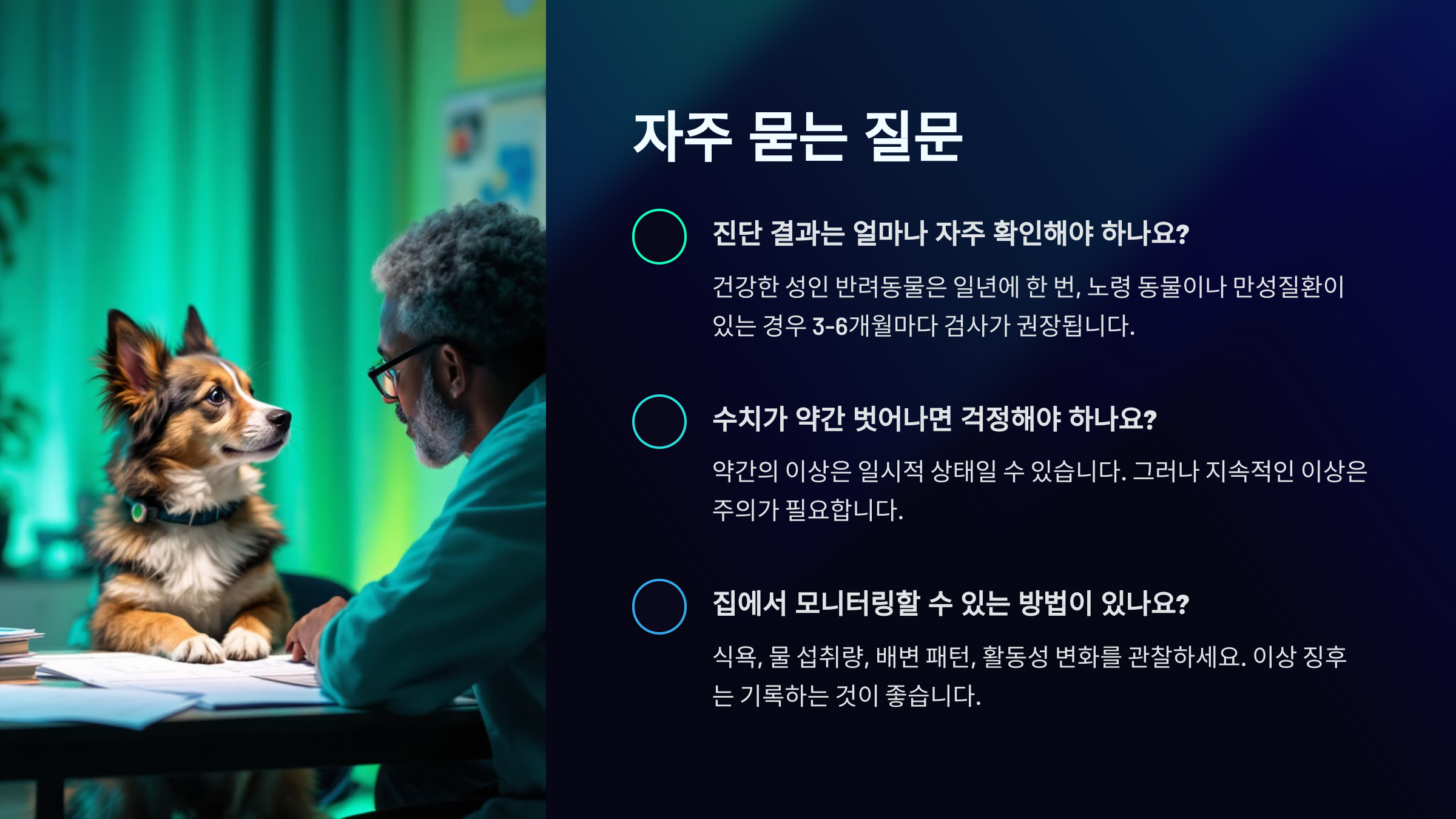 A3. 7세 이상의 시니어 반려동물은 6개월마다 종합검진을 받는 것이 권장돼요. 특별한 질환이 있다면 더 자주 검사를 받아야 할 수도 있어요. 정기 검진을 통해 조기 발견이 가능하답니다.