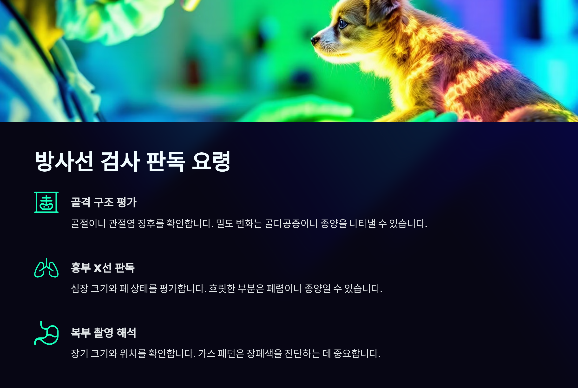 방사선 검사는 전문적인 판독이 필요하니 수의사의 설명을 꼼꼼히 들어보세요. 📷