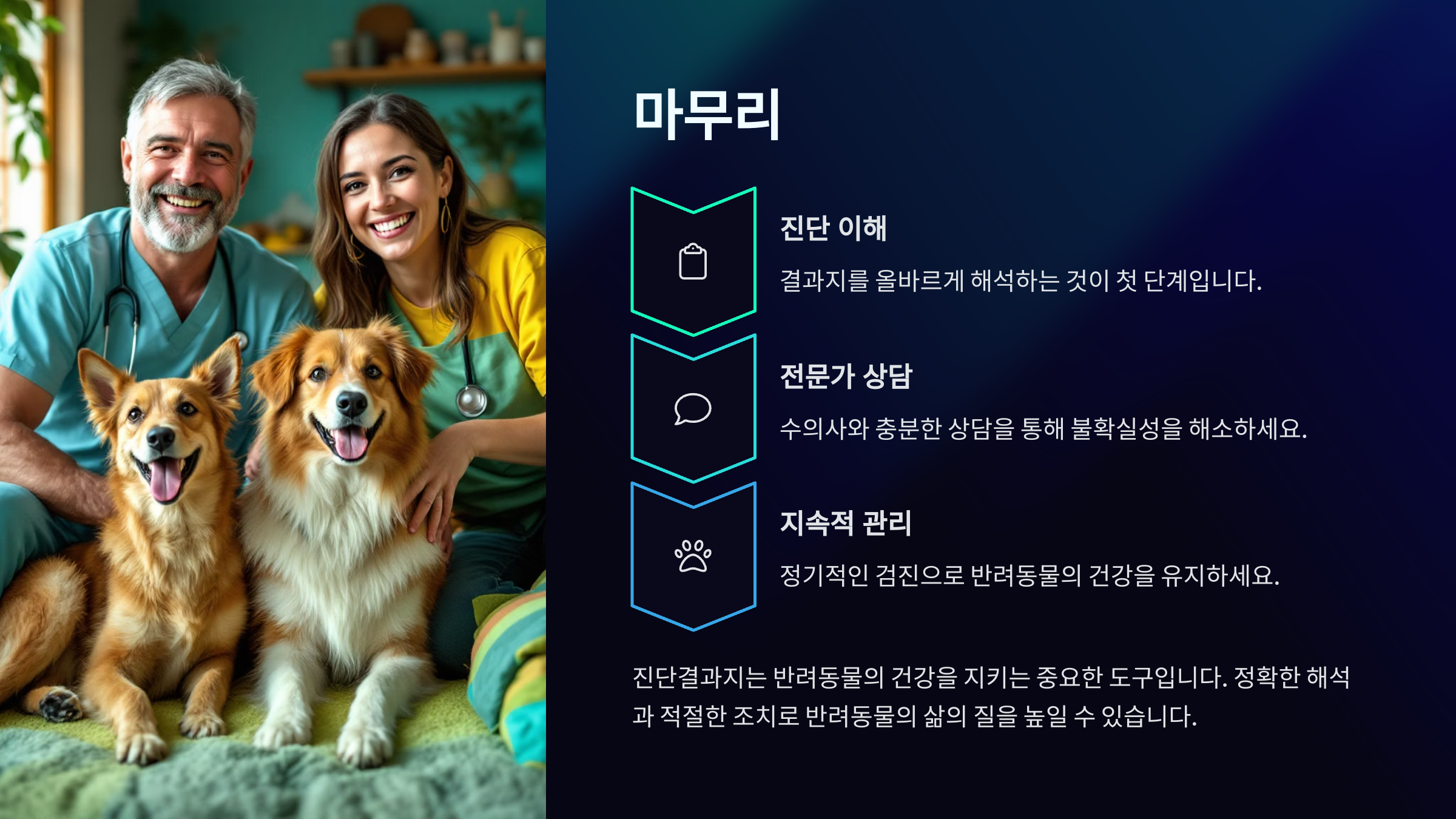정기적인 건강검진은 반려동물의 건강한 삶을 위해 필수적이에요. 특히 나이가 많은 반려동물이나 특정 질환에 취약한 품종의 경우 더욱 신경 써서 관리해야 해요. 진단결과지를 제대로 이해하고 적절히 대응한다면 우리 아이들이 더 건강하고 행복한 삶을 살 수 있을 거예요. 앞으로도 우리 반려동물의 건강을 위해 꾸준한 관심과 사랑을 보여주시길 바라요. 🐾