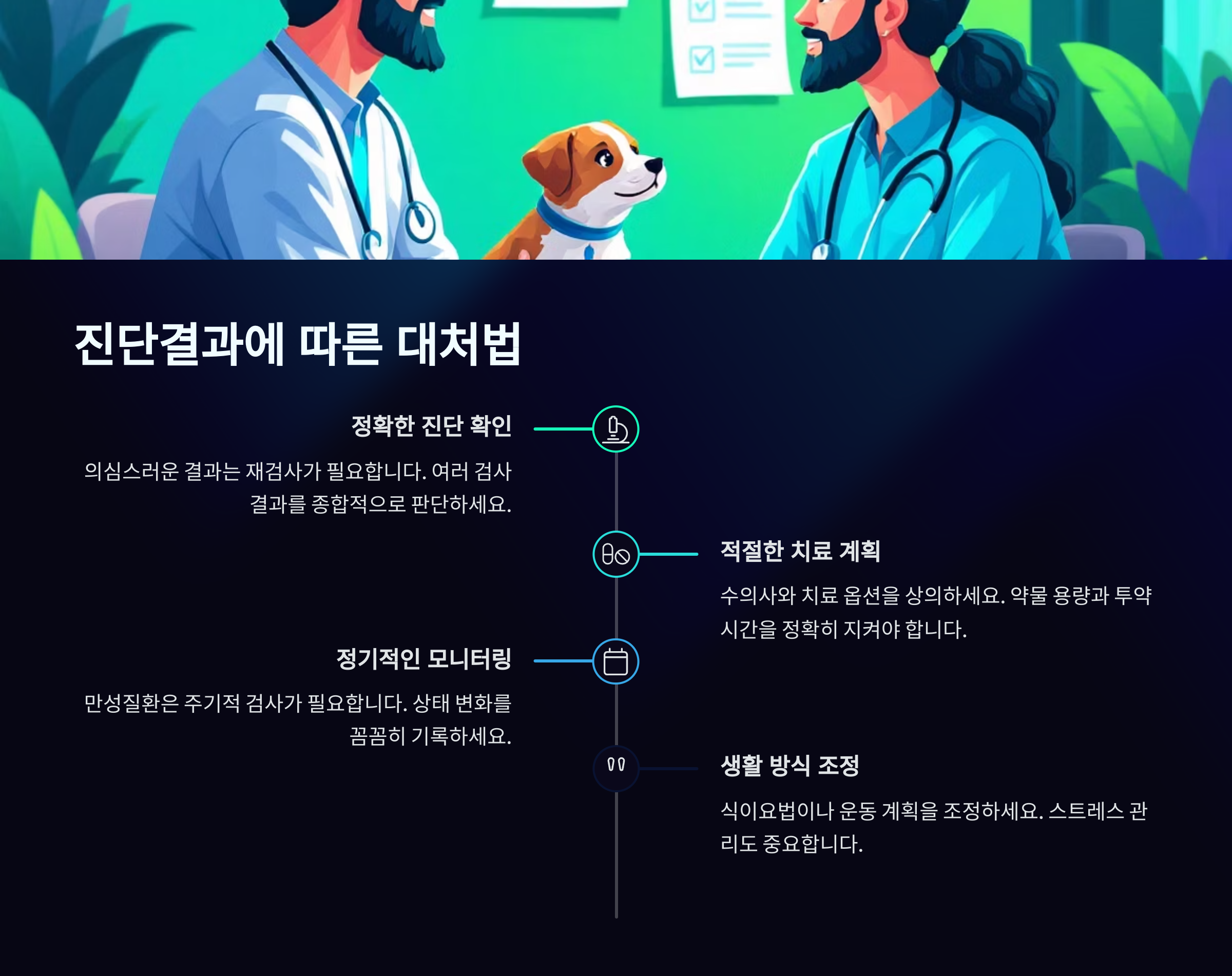 진단 결과에 따른 치료가 시작되면 정기적인 모니터링이 중요해요. 치료 효과를 확인하고 부작용을 감시하기 위해 주기적으로 검사를 받아야 하거든요. 특히 만성 질환의 경우에는 장기간의 관리가 필요하기 때문에 보호자의 역할이 매우 중요해요. 약물 복용, 식이 관리, 운동 조절 등을 꾸준히 실시하고, 이상 증상이 나타나면 즉시 병원에 연락해야 해요.