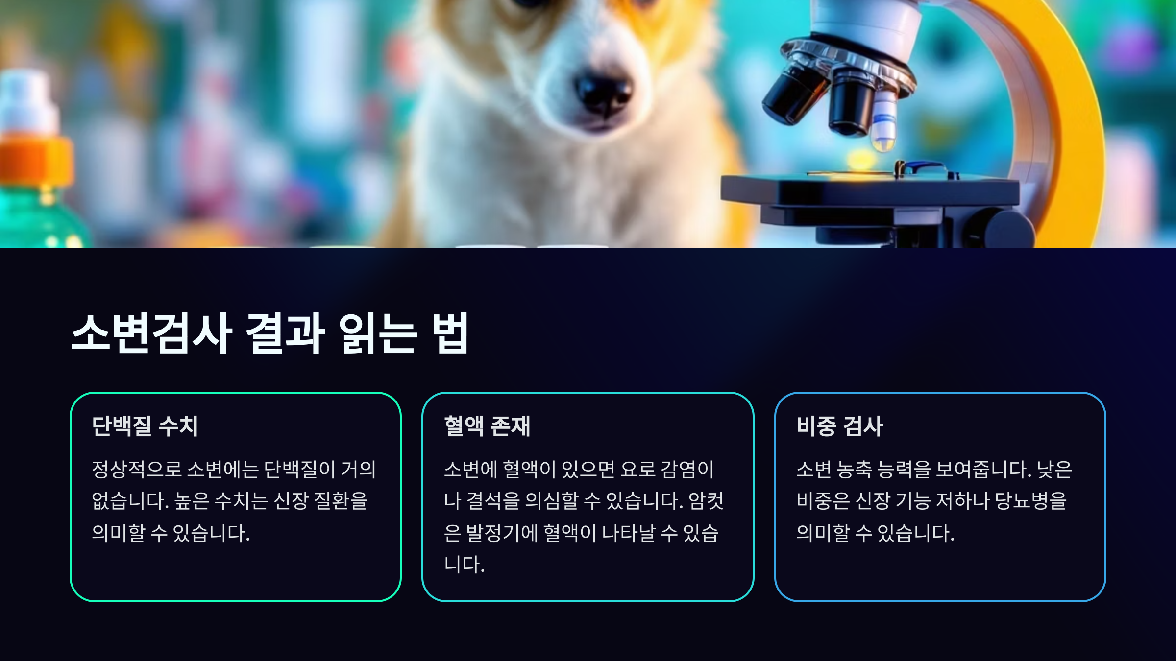 소변검사는 신장 기능과 요로계 건강을 평가하는 가장 기본적인 검사예요. 소변의 색깔, 냄새, 투명도부터 시작해서 다양한 화학적 성분들을 분석하게 됩니다. 정상적인 개와 고양이의 소변은 연한 노란색을 띠고 특별한 냄새가 나지 않아야 해요. 소변이 너무 진하거나 혈뇨가 보인다면 문제가 있을 수 있답니다. 소변검사는 채취 방법에 따라 결과가 달라질 수 있어서 정확한 채취가 중요해요.