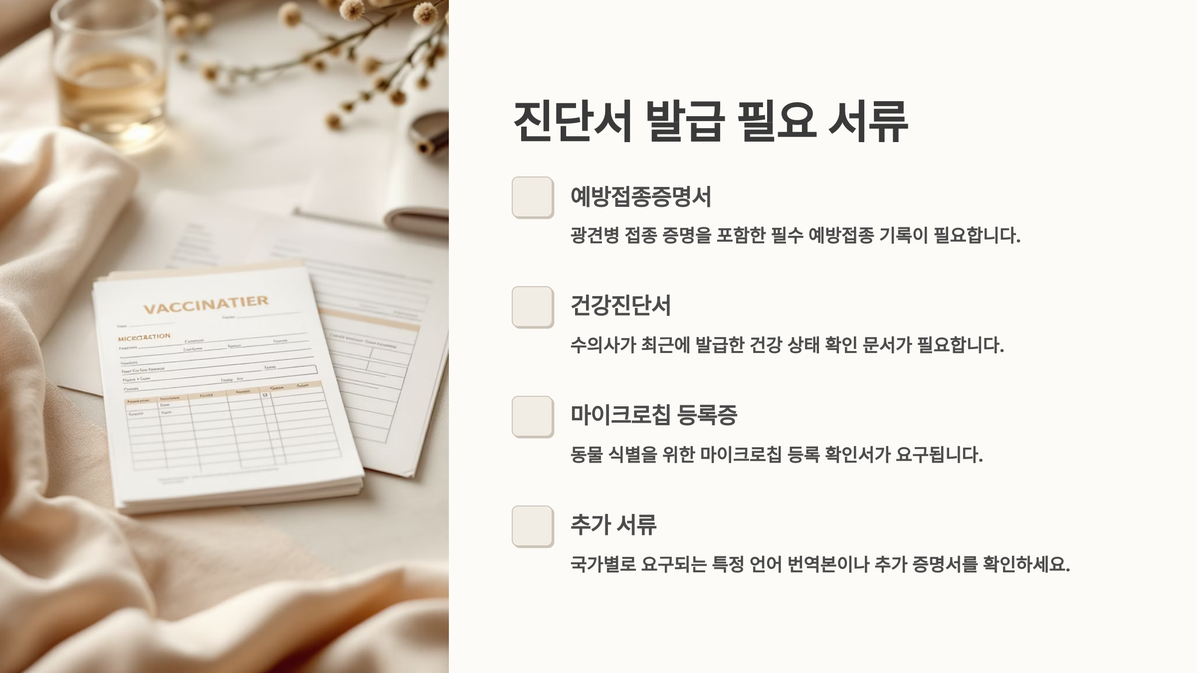 | 항공 탑승 | 등록증, 예방접종증명서 | 건강검진서 |