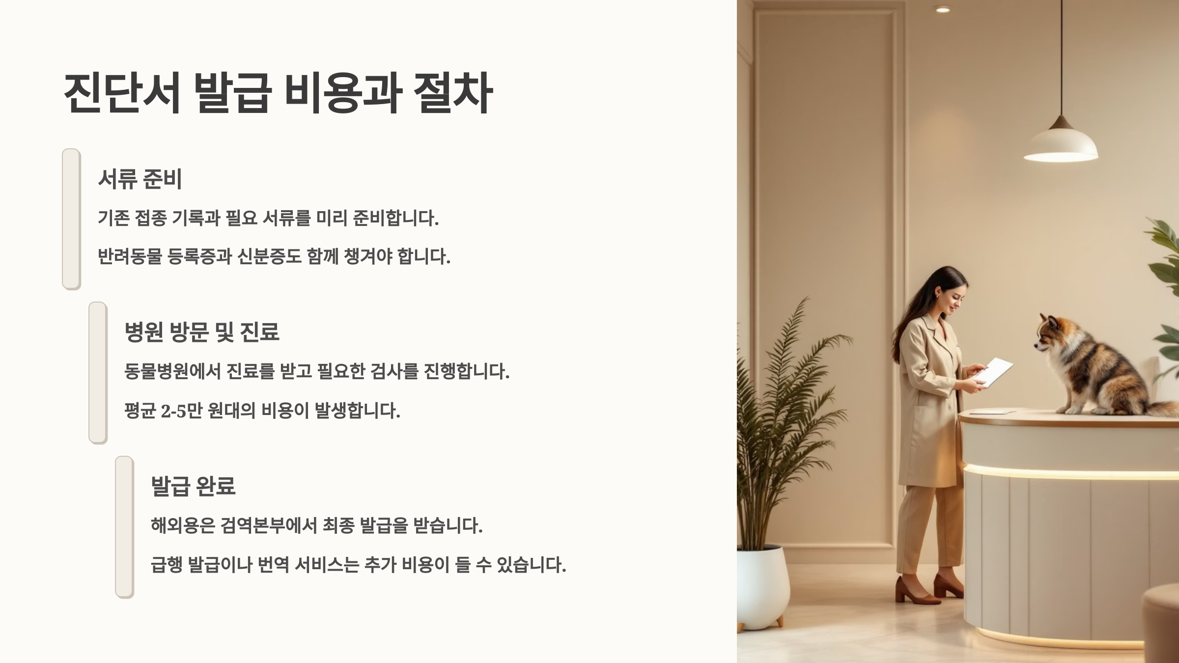 반려동물 진단서 발급을 위한 수의사 진료는 체계적인 과정을 거쳐 진행돼요. 먼저 접수 단계에서 보호자는 진단서 발급 목적을 명확히 전달해야 해요. 보험 청구용인지, 항공 탑승용인지, 해외 출국용인지에 따라 검사 항목과 진료 범위가 달라지기 때문이에요. 수의사는 목적에 맞는 검사 계획을 세우고 예상 소요 시간과 비용을 미리 안내해 줍니다. 일반적으로 기본 진료는 30분에서 1시간 정도 소요되며, 추가 검사가 필요한 경우에는 더 오랜 시간이 걸릴 수 있어요.
