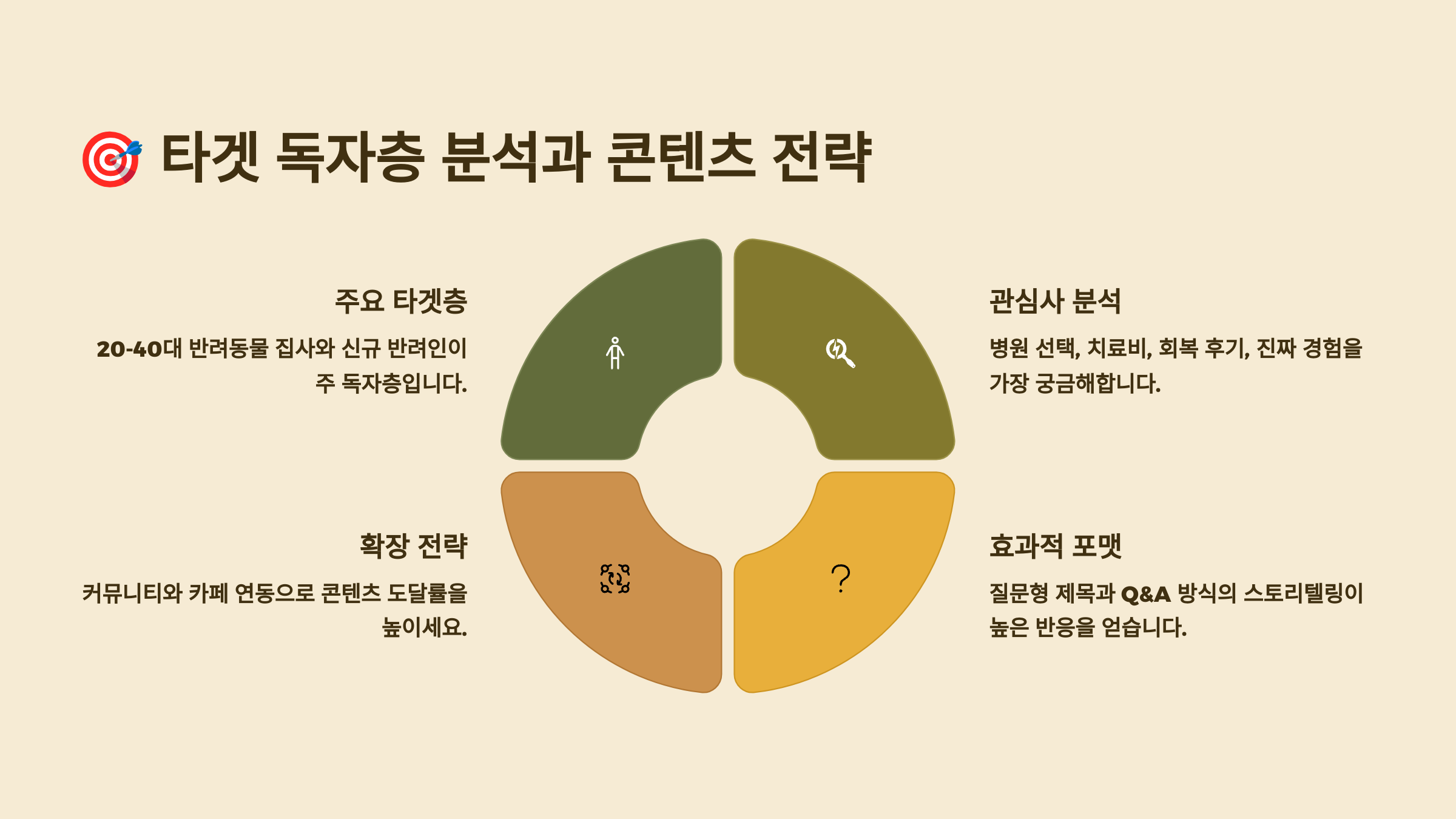감정적 니즈 파악도 필수예요. 아픈 반려동물을 둔 보호자는 위로와 희망이 필요하고, 예방 정보를 찾는 사람은 구체적인 가이드를 원해요. 수술 결정을 앞둔 사람은 경험담과 조언이 필요해요. 각각의 감정 상태에 맞는 톤과 내용으로 접근하는 것이 중요해요.