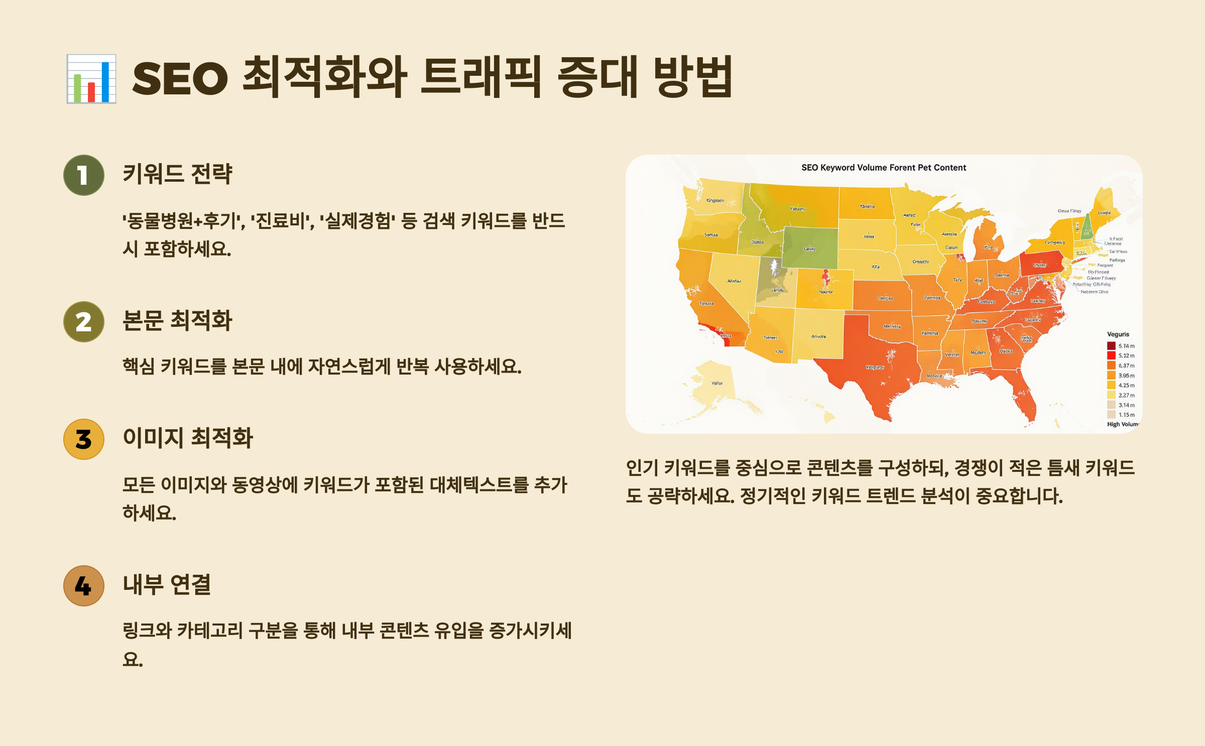 SEO 최적화의 시작은 키워드 리서치예요. 네이버 키워드 플래너, 구글 키워드 플래너를 활용해 검색량이 높은 키워드를 찾아요. '강아지 구토', '고양이 설사' 같은 증상 키워드는 검색량이 매우 높아요. 이런 키워드를 중심으로 콘텐츠를 기획하면 자연스러운 유입을 늘릴 수 있어요.