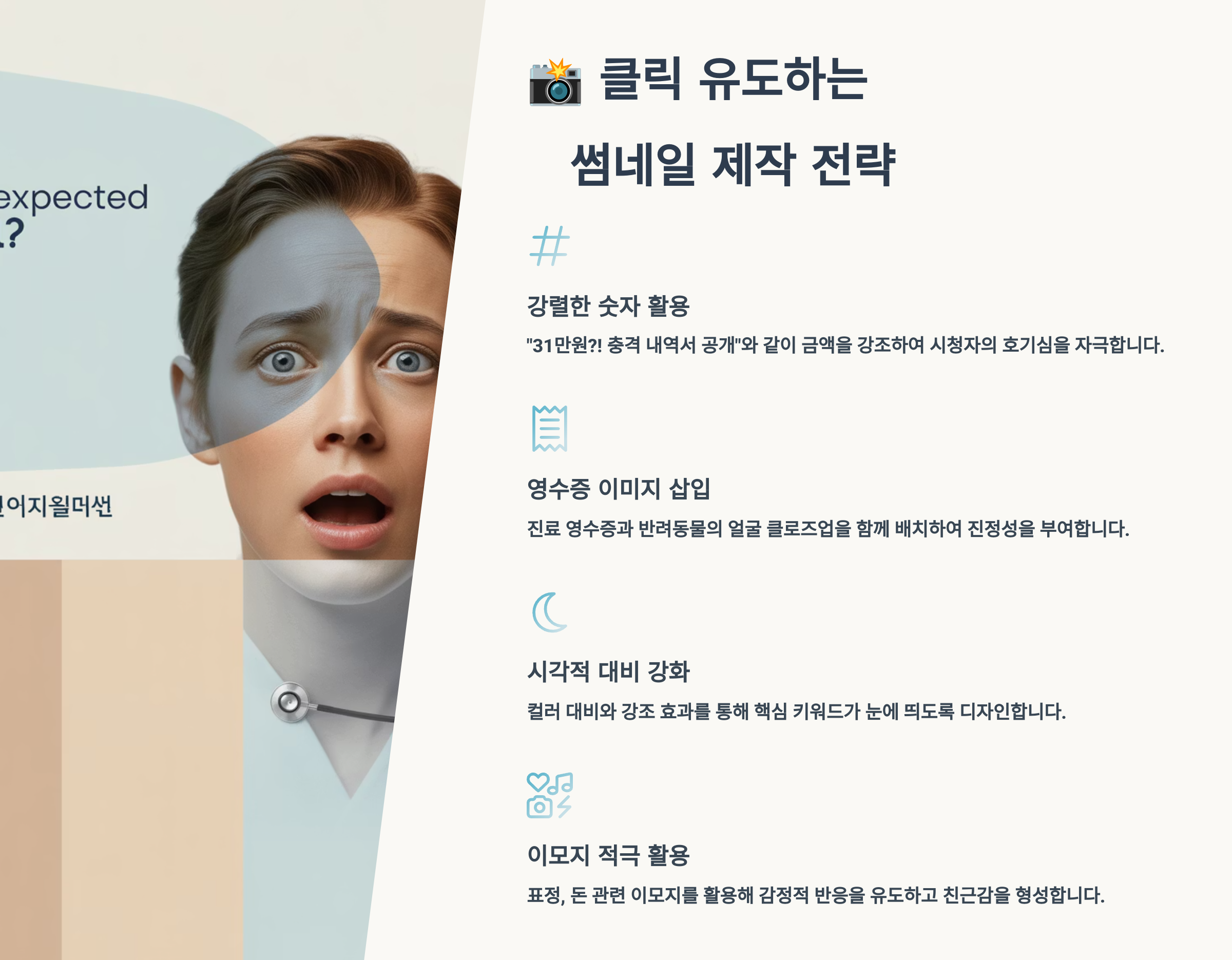 before/after 형식도 매우 효과적이에요. 아픈 모습과 건강해진 모습을 대비시키면서 중간에 병원비를 표시하면, "이 돈을 들여서 이렇게 건강해졌다"는 메시지를 전달할 수 있어요. 또한 여러 병원의 견적서를 한 화면에 비교해서 보여주는 것도 클릭률을 높이는 좋은 방법이에요. "A병원 300만원 vs B병원 150만원" 같은 비교는 호기심을 자극하죠.