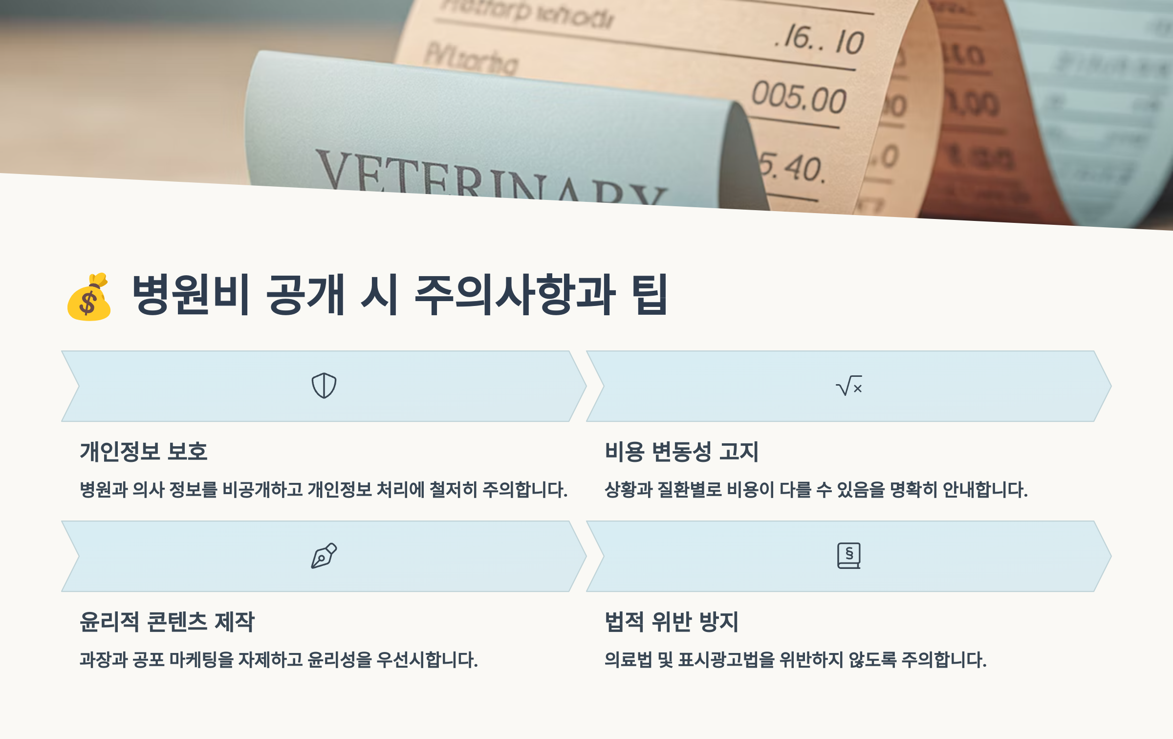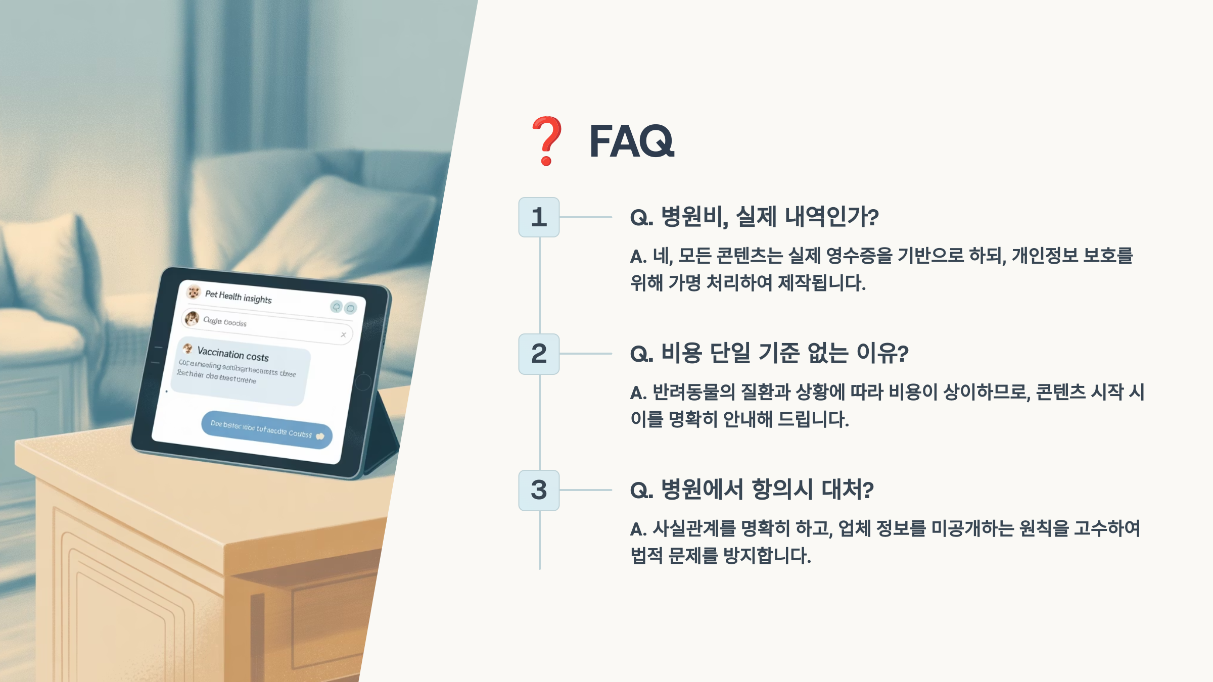 반려동물 병원비 공개 콘텐츠는 단순한 조회수 장사가 아니라, 반려인들에게 실질적인 도움을 주는 가치 있는 정보 공유예요. 투명하고 정직한 정보 제공을 통해 다른 반려인들이 미리 준비하고 현명한 결정을 내릴 수 있도록 돕는 것이 이 콘텐츠의 진정한 의미죠. 높은 병원비에 놀라고 당황하는 반려인들에게 여러분의 경험은 큰 위로와 도움이 될 거예요.