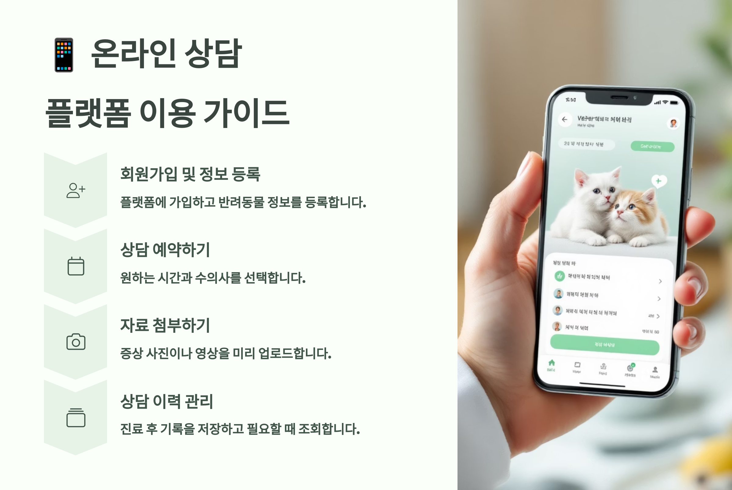 화상 상담은 실시간으로 반려동물의 상태를 직접 보여줄 수 있어서 더욱 정확한 상담이 가능해요. 피부 트러블이나 눈의 이상, 걸음걸이 문제 등은 말로 설명하기 어려운 경우가 많은데, 화상 통화를 통해 수의사가 직접 관찰할 수 있어요. 또한 반려동물의 반응이나 행동을 실시간으로 보면서 상담받을 수 있어 더욱 구체적이고 실질적인 조언을 받을 수 있답니다. 다만 반려동물이 카메라 앞에서 긴장하거나 숨어버릴 수 있으니 미리 익숙하게 해두는 것이 좋아요. 평소 스마트폰이나 태블릿에 관심을 보이는 아이들은 화상 상담에 적응하기 쉬워요.