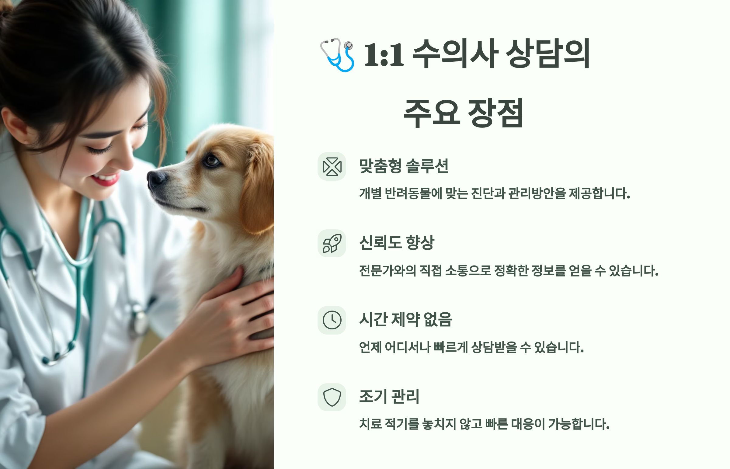 반려동물을 키우다 보면 갑작스러운 건강 문제나 행동 변화로 걱정이 될 때가 많아요. 특히 새벽이나 늦은 시간, 휴일에 응급상황이 발생하면 어디에 도움을 요청해야 할지 막막하죠. 이런 상황에서 수의사 1:1 상담은 정말 큰 도움이 되는 서비스랍니다. 전문 수의사와 직접 소통하며 우리 아이의 상태를 정확히 파악하고 적절한 조치를 받을 수 있어요.