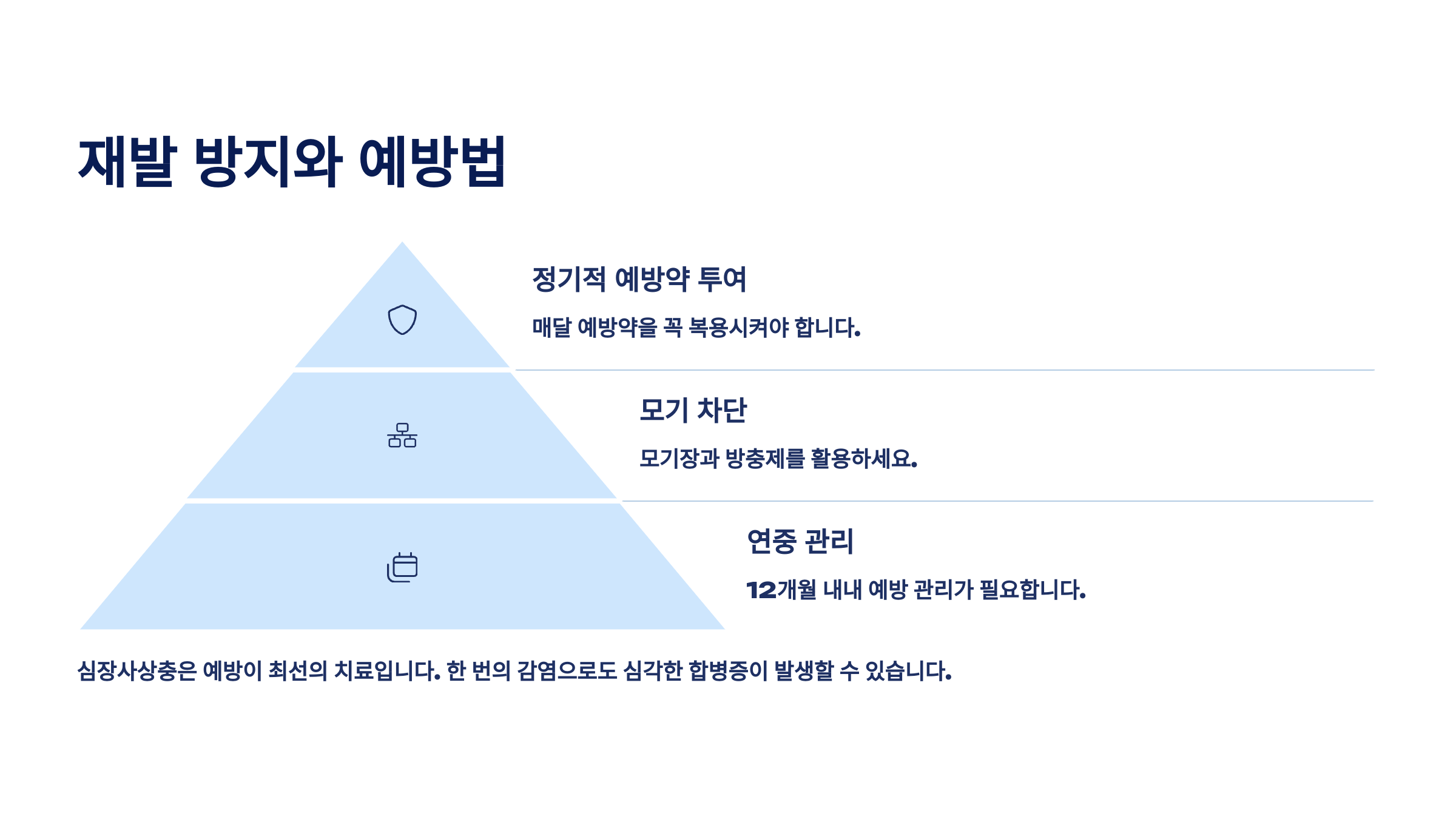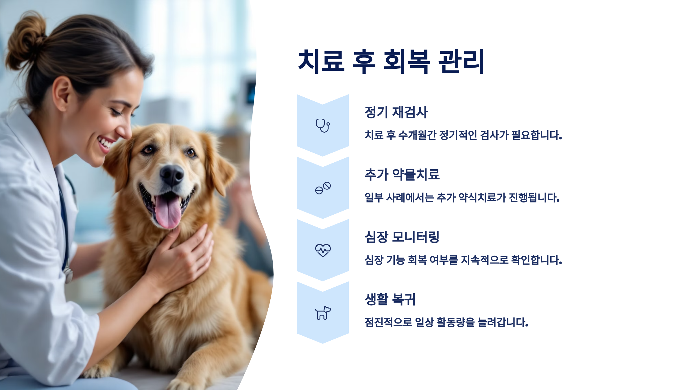 치료가 완료된 후에는 재발 방지를 위한 평생 관리가 필요해요. 정기적인 예방약 투여와 건강검진을 통해 우리 아이를 심장사상충으로부터 영원히 보호할 수 있어요. 또한 다른 반려동물을 키우는 가족들에게도 심장사상충의 위험성과 예방의 중요성을 알려주세요. 모든 반려동물이 건강하게 오래 살 수 있도록 함께 노력하는 것이 중요해요! 💪❤️