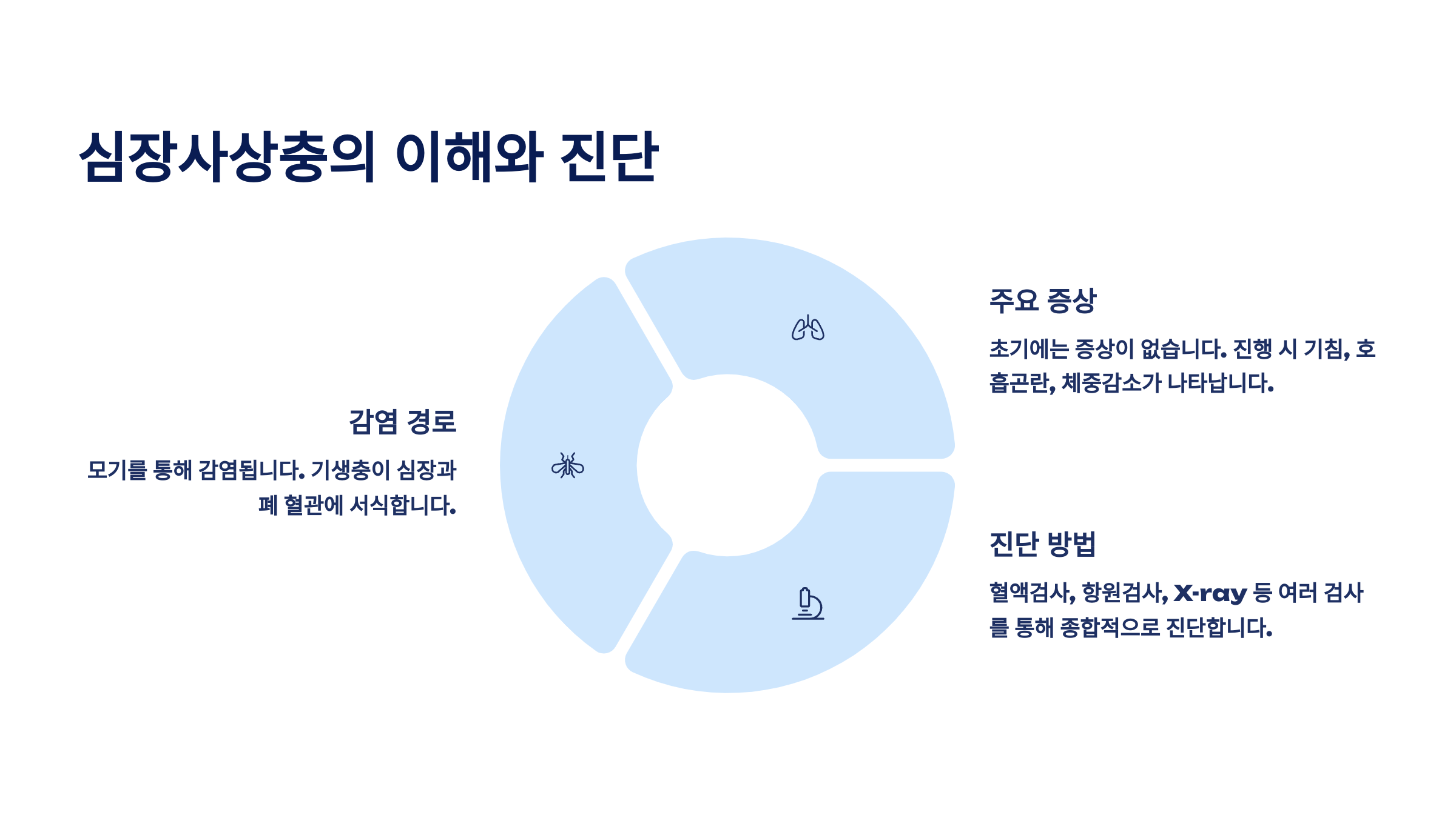 심장사상충은 반려동물, 특히 강아지에게 치명적인 기생충 질환이에요. 모기를 통해 전파되는 이 질병은 심장과 폐동맥에 기생하면서 생명을 위협할 수 있는 심각한 상황을 만들어요. 하지만 적절한 치료와 관리를 통해 완치가 가능한 질병이기도 해요. 보호자가 올바른 지식을 갖고 있다면 우리 아이를 건강하게 지킬 수 있답니다.