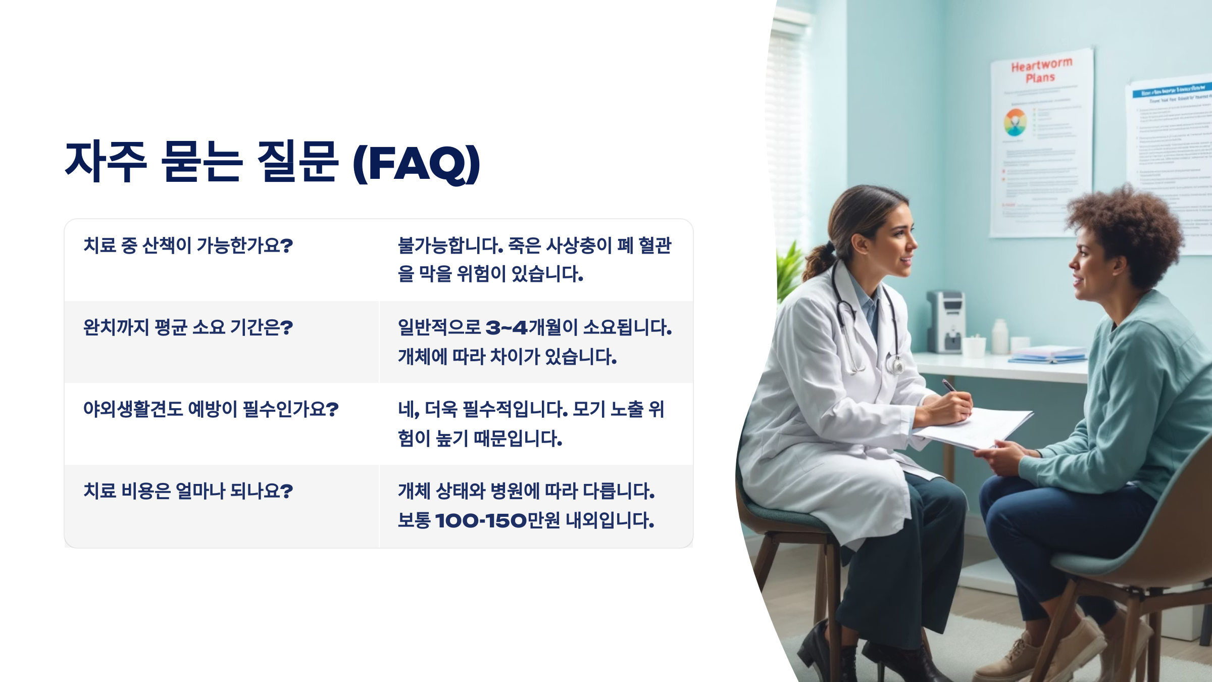 심장사상충은 분명 심각한 질병이지만, 적절한 치료와 관리를 통해 충분히 극복할 수 있는 질병이에요. 가장 중요한 것은 조기 발견과 정확한 치료, 그리고 보호자의 세심한 관리예요. 치료 과정이 길고 힘들 수 있지만, 우리 아이의 건강한 미래를 위해 끝까지 포기하지 말고 함께 이겨내야 해요. 수의사의 지시를 정확히 따르고, 정기적인 검진을 통해 회복 상태를 지속적으로 확인하는 것이 중요해요.