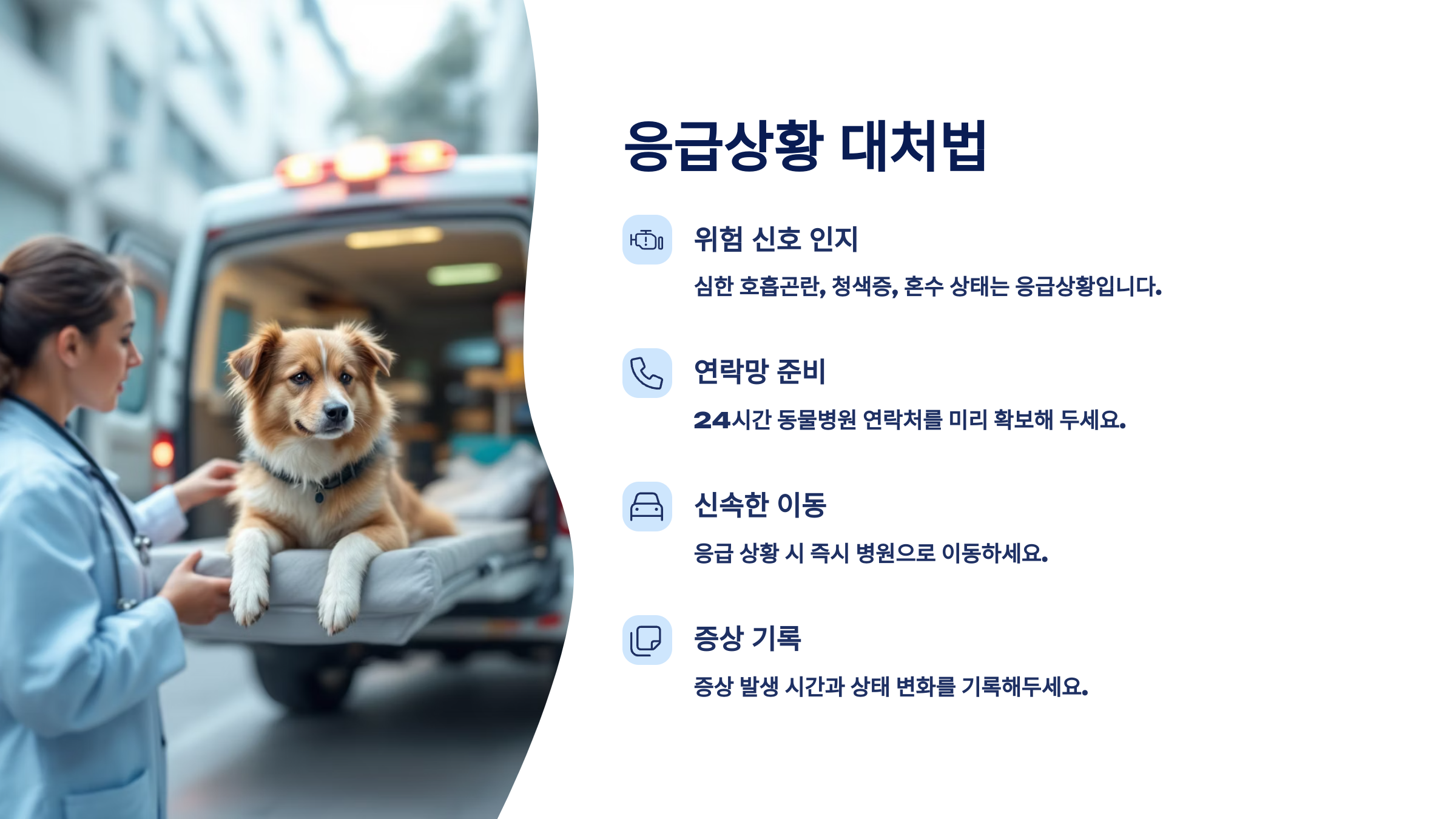 심장사상충 치료 과정에서 발생할 수 있는 응급상황을 미리 알아두고 대처 방법을 숙지하는 것이 매우 중요해요. 가장 위험한 응급상황은 폐색전증으로, 죽은 성충이 폐혈관을 막으면서 발생해요. 주요 증상으로는 갑작스러운 심한 호흡곤란, 지속적인 거친 기침, 혈담, 창백한 잇몸, 의식 잃음, 쓰러짐 등이 있어요. 이런 증상이 나타나면 즉시 가장 가까운 응급 동물병원으로 이송해야 해요. 이송 중에는 반려동물을 흥분시키지 않도록 조용히 하고, 머리를 약간 높게 해서 호흡을 돕도록 해주세요.