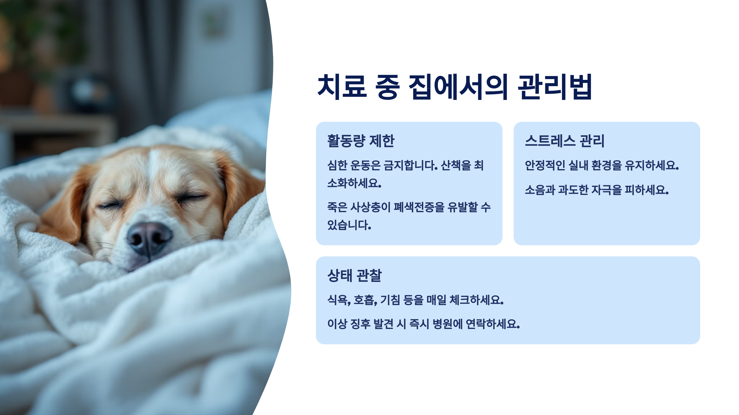 치료 기간 중 가정에서의 관리는 치료 성공에 결정적인 역할을 해요. 가장 중요한 것은 절대적인 운동 제한이에요. 실내에서도 뛰거나 계단을 오르내리는 행동을 금지하고, 외출 시에는 반드시 목줄을 착용하고 천천히 걸어야 해요. 흥분하거나 스트레스받는 상황을 피하는 것도 중요한데, 다른 동물이나 사람과의 과도한 접촉, 큰 소음, 환경 변화 등을 최소화해야 해요. 케이지나 울타리를 활용해서 움직임을 제한하는 것도 좋은 방법이에요. 하루 종일 케이지에만 가둬두는 것은 스트레스를 줄 수 있으니까, 조용한 시간에 잠깐씩 나와서 가벼운 활동을 하도록 해주세요.