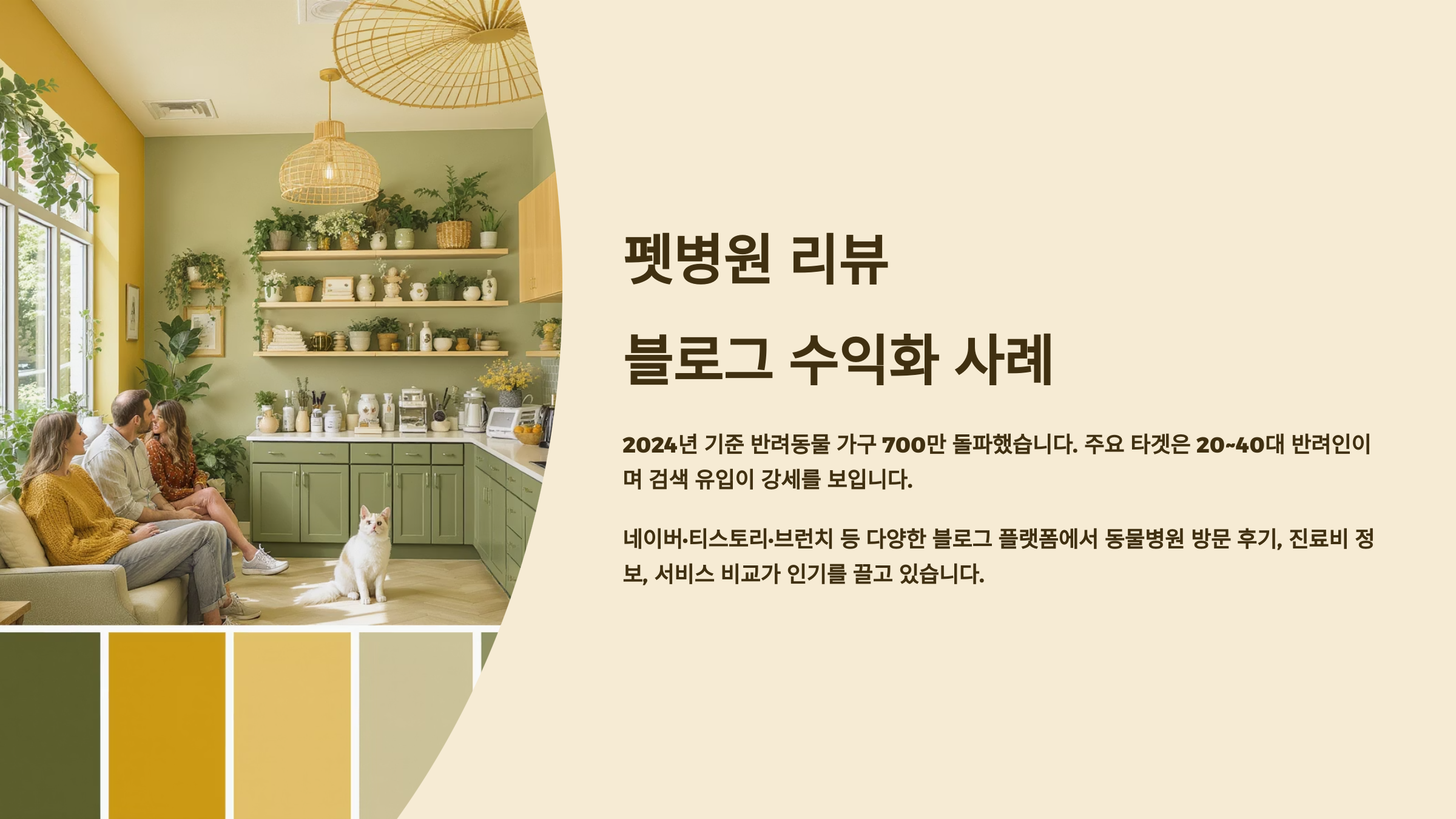 펫병원 리뷰 블로그는 2025년 현재 가장 수익성 높은 블로그 분야 중 하나예요. 반려동물 인구 1500만 시대를 맞아 펫병원 정보를 찾는 사람들이 급증하면서, 양질의 리뷰 콘텐츠에 대한 수요가 폭발적으로 늘어났답니다. 실제로 월 방문자 10만명 이상의 펫병원 리뷰 블로그들은 월 500만원 이상의 수익을 올리고 있어요.