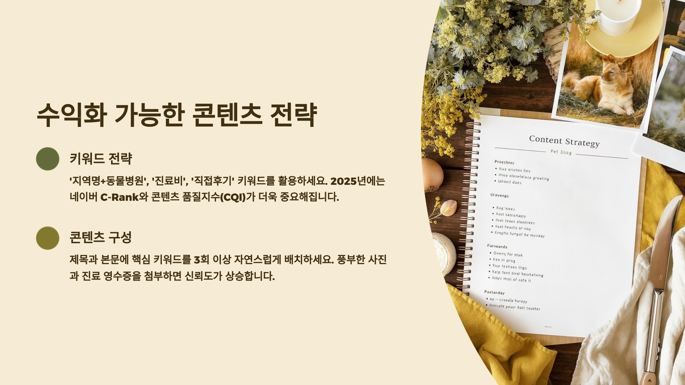수익화를 위한 콘텐츠 전략의 핵심은 '검색 의도'를 정확히 파악하는 것이에요. 펫병원을 검색하는 사람들은 대부분 급한 상황이거나 비용이 걱정되는 경우가 많아요. 따라서 '강아지 구토 응급실', '고양이 혈뇨 치료비', '새벽 동물병원' 같은 긴급성 있는 키워드로 콘텐츠를 만들면 트래픽이 높아져요.