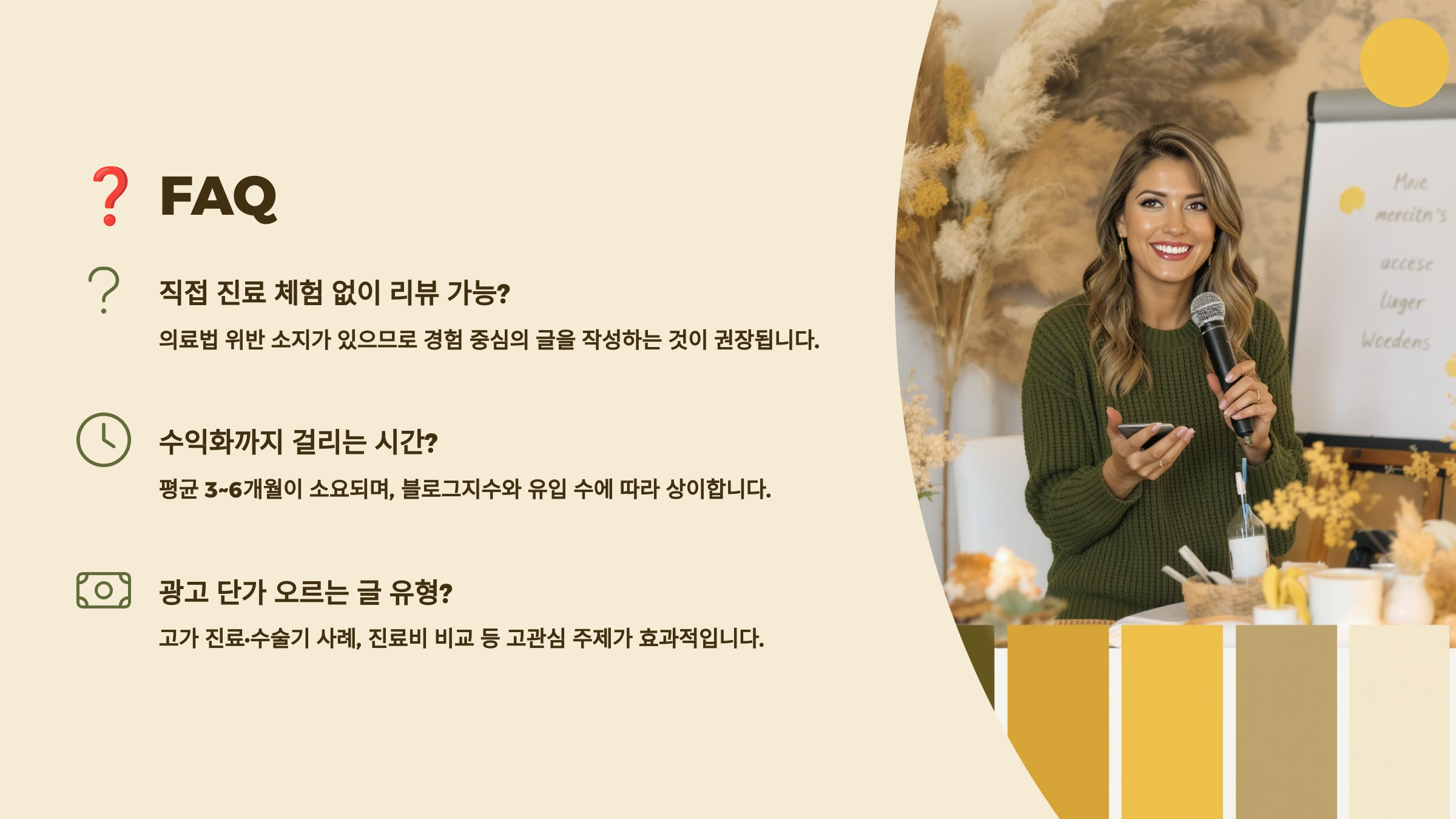A8. 받을 수 있지만 투명하게 공개해야 해요. 협찬받은 사실을 명시하고, 그래도 객관적인 리뷰를 작성하는 것이 중요해요. 독자들의 신뢰를 잃으면 장기적으로 손해니까요. 병원과 좋은 관계를 유지하면서도 독립적인 리뷰어로서의 정체성을 지키는 것이 핵심이에요. 협찬 받은 경우에도 단점은 솔직하게 언급하는 것이 오히려 신뢰를 높여요.