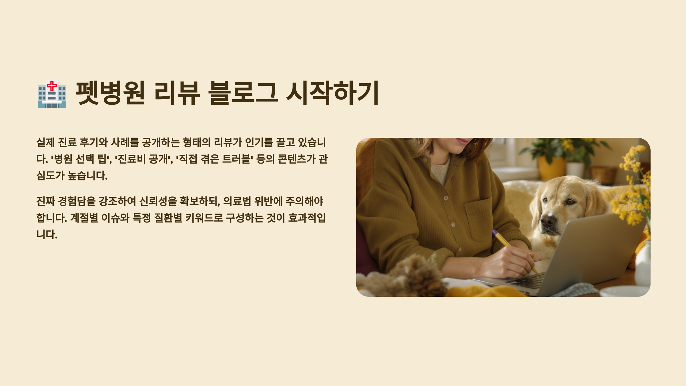 A5. 펫 시장이 계속 성장하고 있어서 오히려 기회가 많아요. 전국에 동물병원이 5000개 이상 있는데, 제대로 된 리뷰가 있는 곳은 10%도 안 돼요. 지역별, 전문 분야별로 세분화하면 충분히 차별화할 수 있어요. 특히 지방 도시나 특정 질병 전문 병원 리뷰는 아직 블루오션이에요. 꾸준함과 전문성으로 승부하면 충분히 성공할 수 있어요.