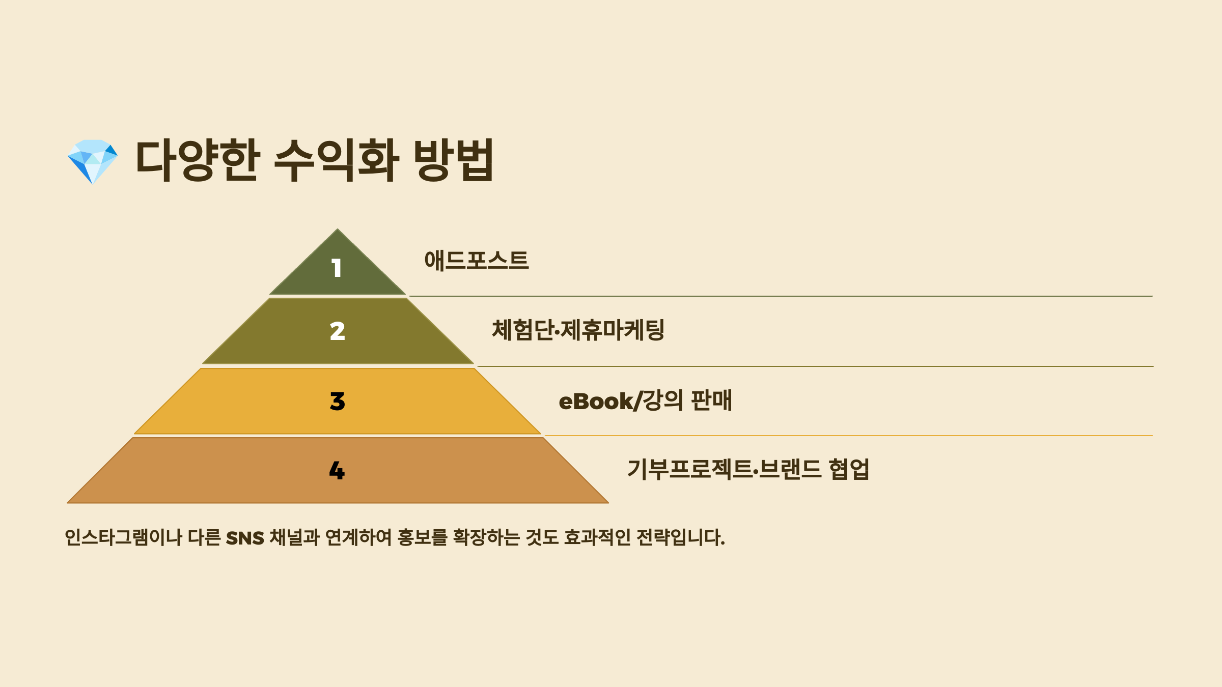 | 수익화 방법 | 예상 수익 | 난이도 |