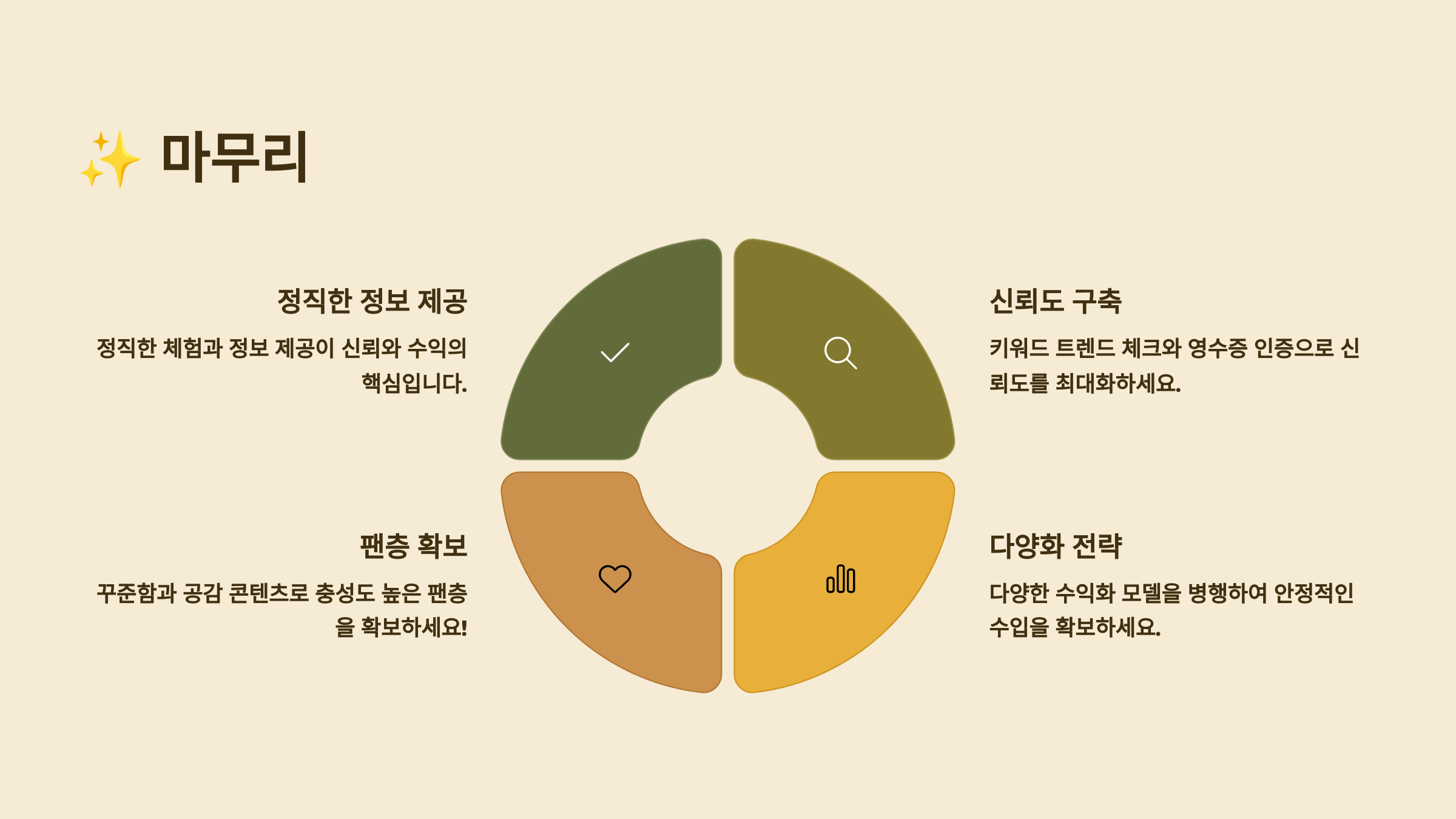 성공의 핵심은 진정성이에요. 광고 수익을 위해 과장된 리뷰를 쓰거나 부정확한 정보를 제공하면 금방 독자들에게 외면받아요. 실제 경험을 바탕으로 솔직하고 유용한 정보를 제공하면서, 동시에 비즈니스 마인드를 가지고 전략적으로 운영하는 것이 중요해요.