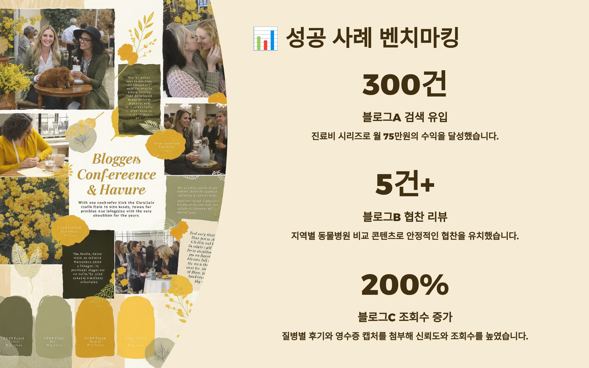 '서울 동물병원 탐방기'는 차별화된 콘텐츠로 성공한 케이스예요. 단순 리뷰가 아니라 수의사 인터뷰, 병원 시설 360도 사진, 의료장비 설명 등 깊이 있는 정보를 제공했어요. 특히 '수의사가 추천하는 동물병원' 시리즈는 큰 화제가 되어 언론에도 소개되었고, 이를 계기로 출판 제안까지 받았다고 해요.