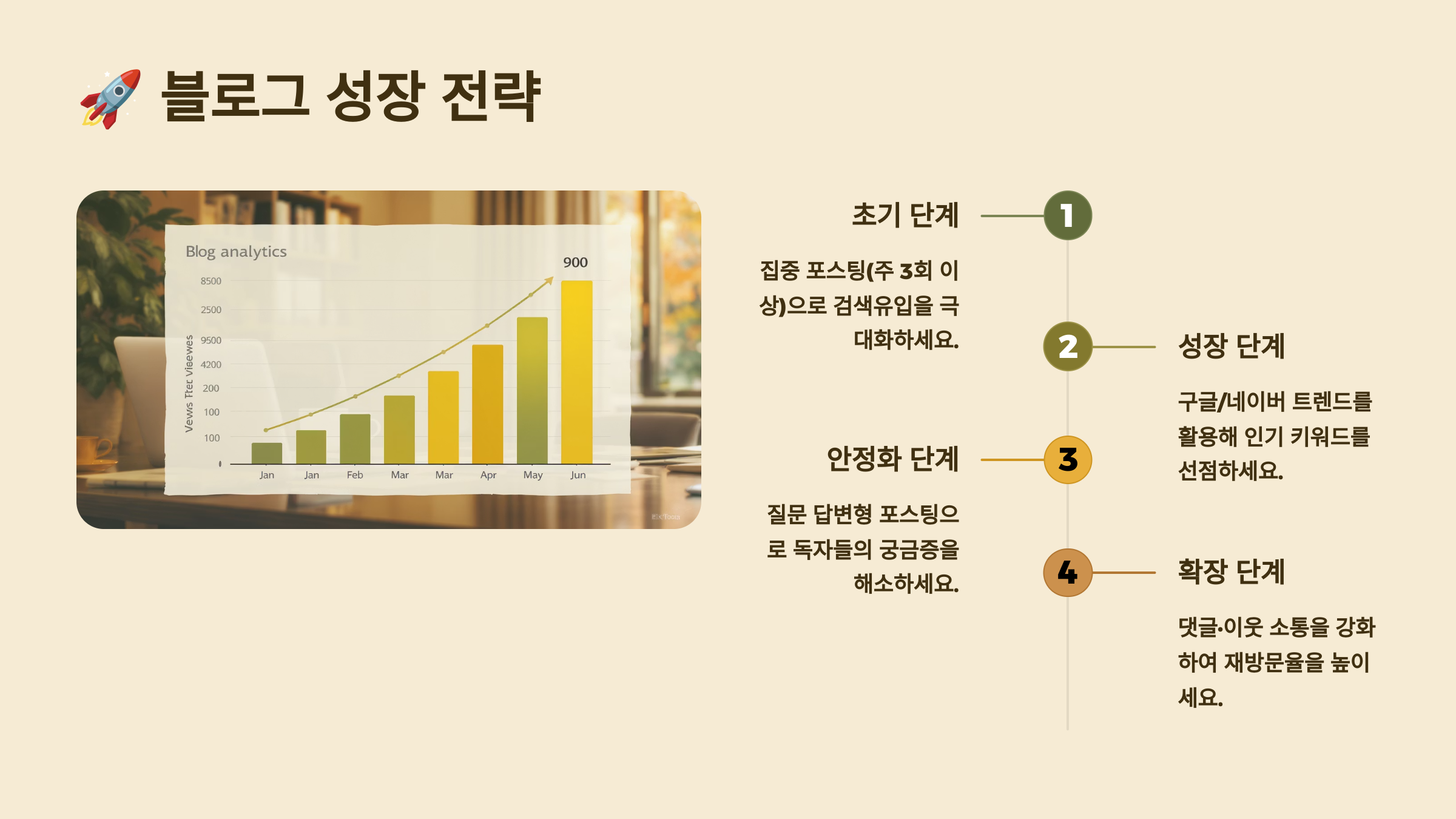 초기에는 주 3-4회 정도 꾸준히 포스팅하는 것이 중요해요. 한 달에 15-20개 정도의 양질의 콘텐츠를 올리면 3개월 내에 검색 유입이 늘어나기 시작해요. 포스팅 시간은 평일 저녁 7-9시, 주말 오전 10-12시가 가장 조회수가 높더라고요. 이 시간대에 맞춰서 예약 발행하면 더 많은 사람들에게 노출될 수 있어요.
