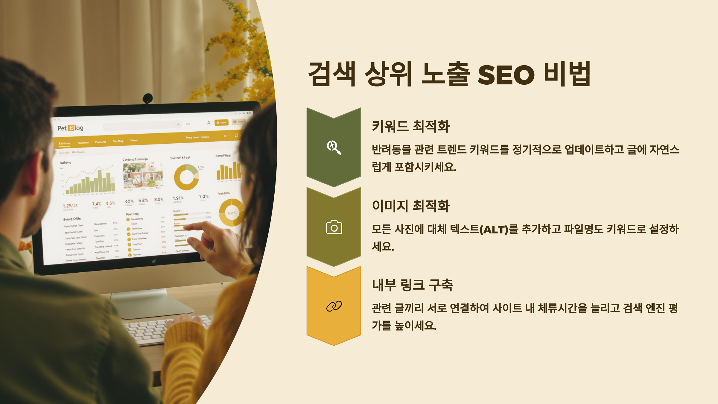 펫병원 리뷰 블로그의 SEO 전략은 일반 블로그와는 조금 달라요. 지역 기반 검색이 많기 때문에 로컬 SEO가 특히 중요해요. 제목에는 반드시 지역명을 포함시키고, '강남 동물병원', '분당 24시 동물병원' 같은 구체적인 키워드를 사용해야 해요. 본문에도 주소, 지하철역, 주변 랜드마크 등을 자연스럽게 언급하면 좋아요.