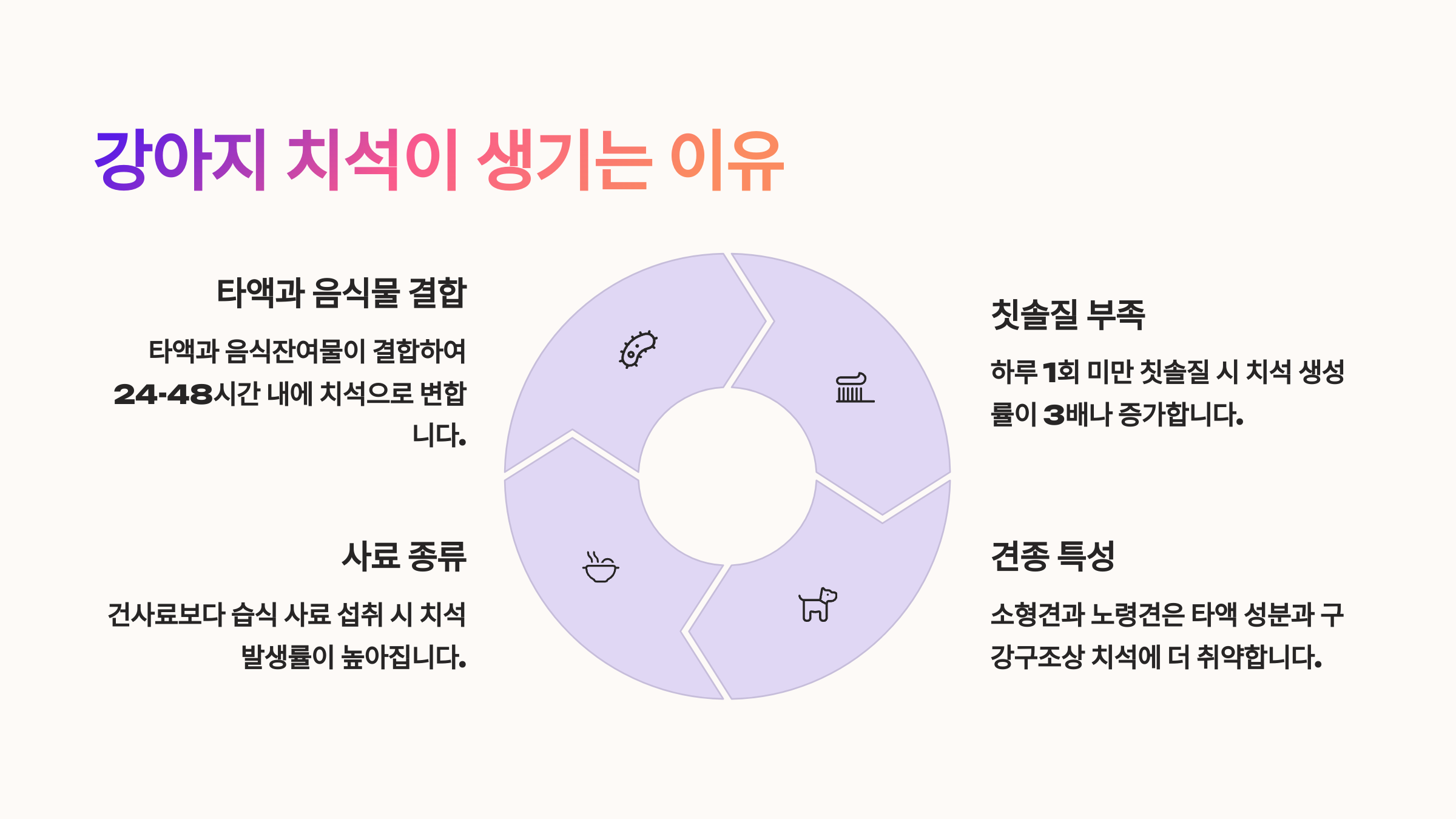 강아지에게 치석이 생기는 주요 원인은 다음과 같아요: