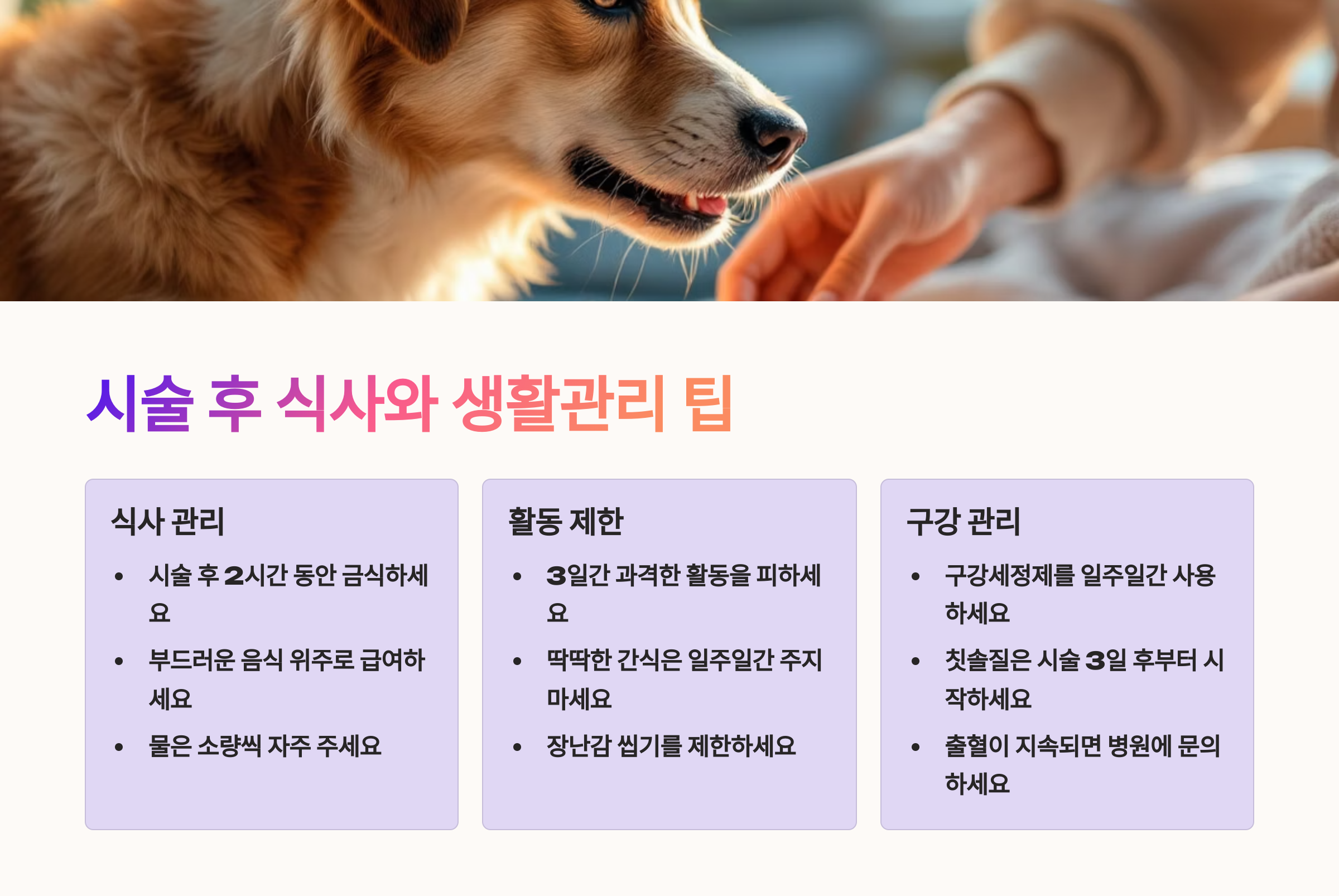 🍖 시술 후 관리가 정말 중요해요. 강아지가 아픈 기억 없이 빠르게 회복하려면 집에서도 세심한 보살핌이 필요해요. 특히 입 안이 민감해진 상태라 사료부터 생활패턴까지 신경 써야 하는 부분이 많아요 🩺