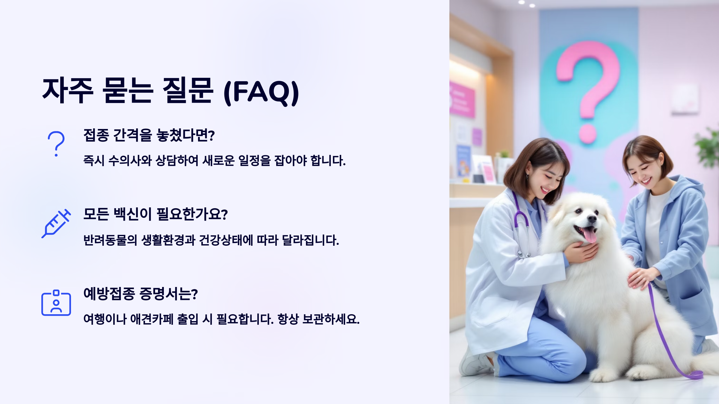 🐾 마지막으로, 반려동물 예방접종에 대해 무조건적인 불안보다는, 올바른 정보와 전문가와의 신뢰를 바탕으로 현명하게 접근하는 게 중요하다고 생각해요. 반려동물은 우리의 가족이니까요! 🐶🐱