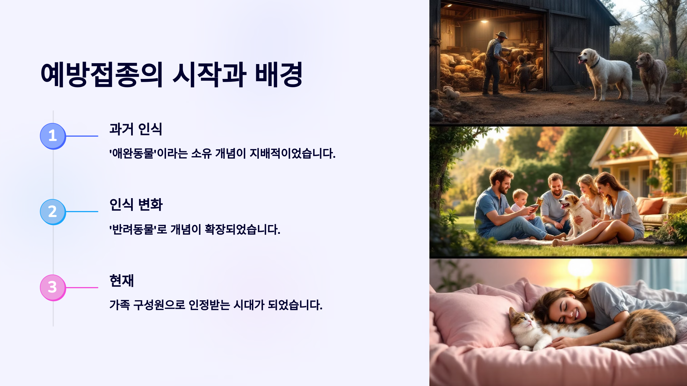 💡 반려동물의 예방접종은 인간의 백신과 마찬가지로 질병 예방을 목적으로 해요. 세계적으로 반려동물에 대한 백신은 19세기 말부터 시작되었고, 20세기 들어 다양한 동물 백신이 개발되면서 지금처럼 체계적인 접종 시스템이 자리 잡았답니다.