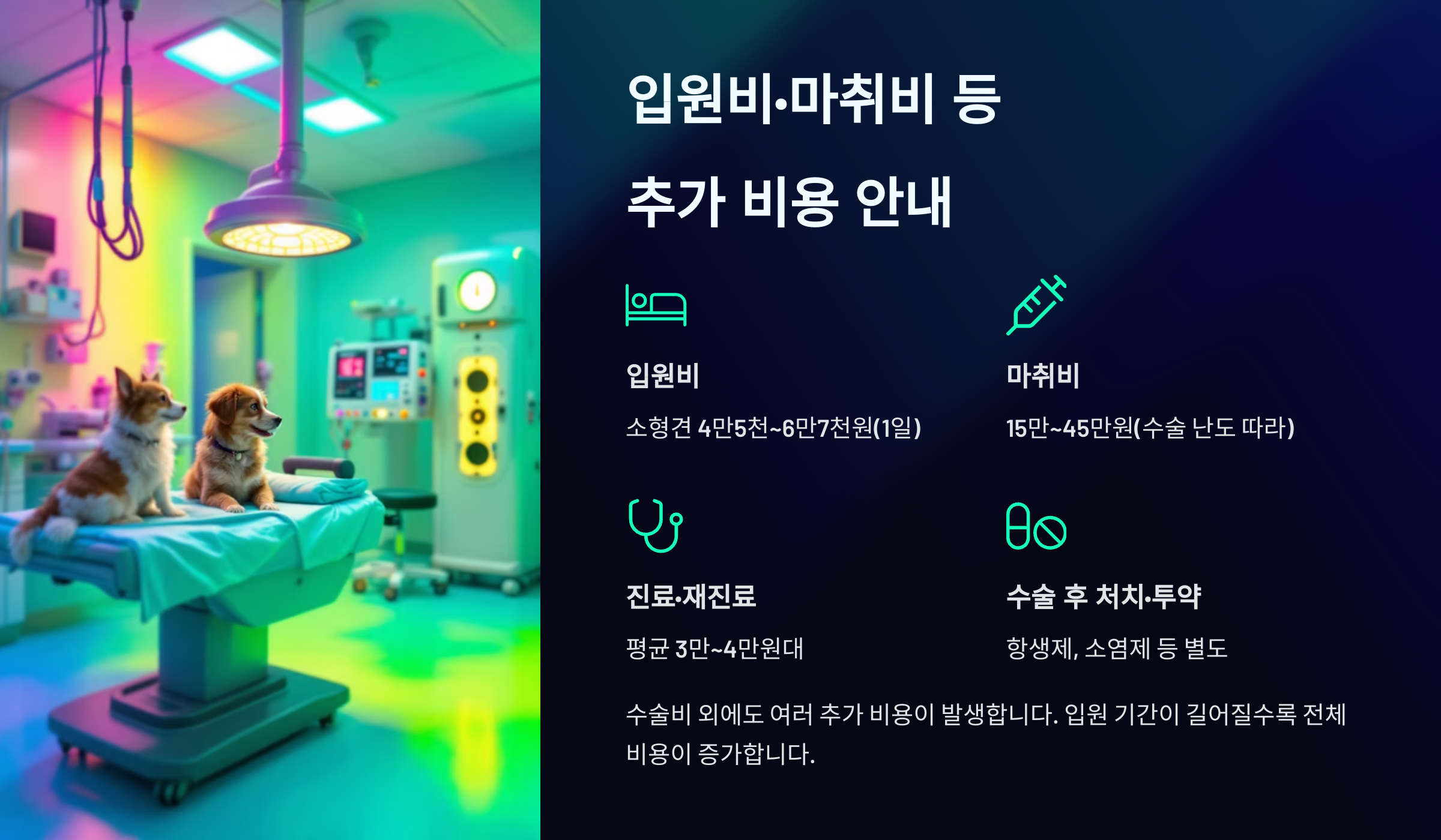 수술 외에 마취비, 입원비, 검사비가 따로 붙는 경우가 많고, 수술 후 처치나 통원 재진료가 추가로 발생할 수 있어요. 반드시 사전에 전체 예상 견적을 확인해두는 게 중요해요. 📌