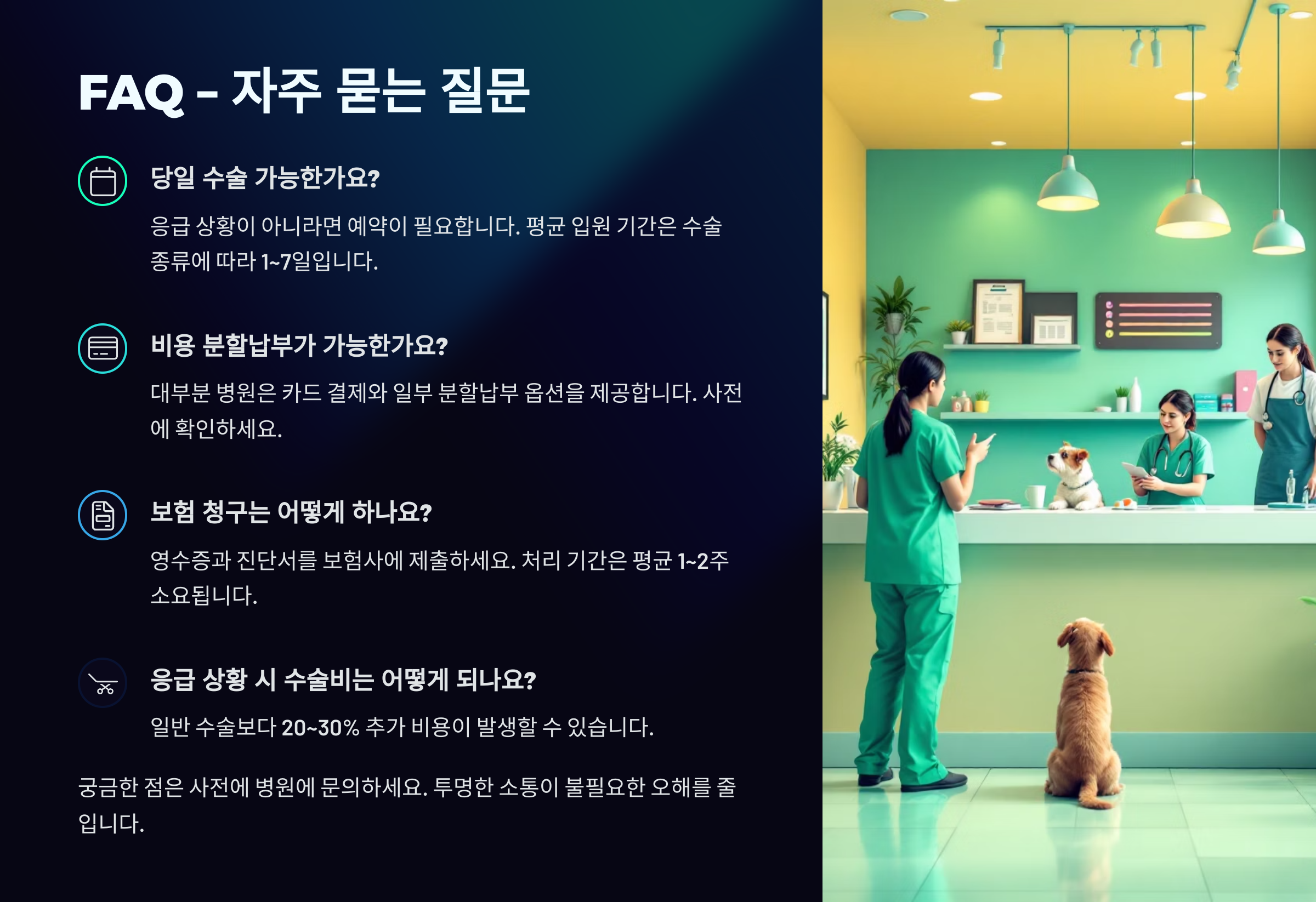 이제 다음은 ❓ FAQ 섹션이에요! 수술비와 관련해서 보호자분들이 가장 자주 묻는 실제 질문 8가지를 정리해드릴게요! 😊