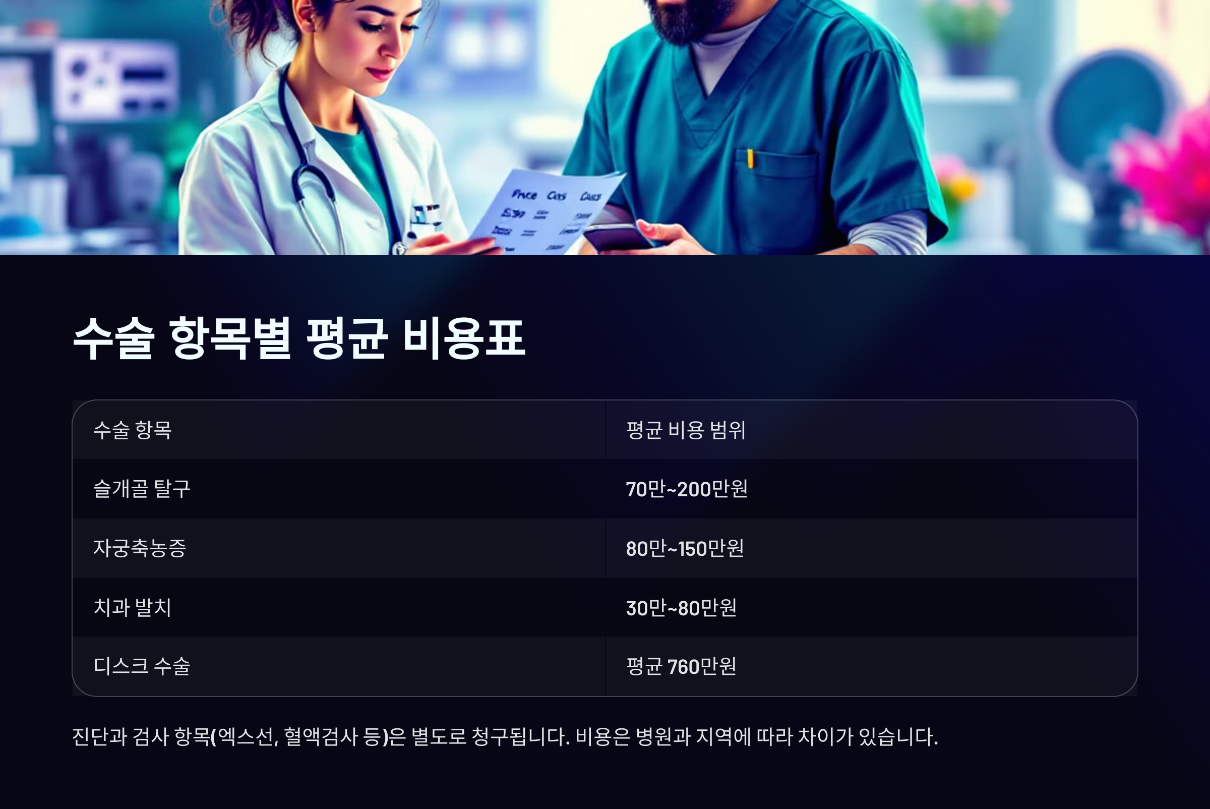 다음은 💳 수술 항목별 평균 비용표를 보여드릴게요! 실제로 가장 많이 묻는 수술별 금액이 궁금하셨죠? 😊