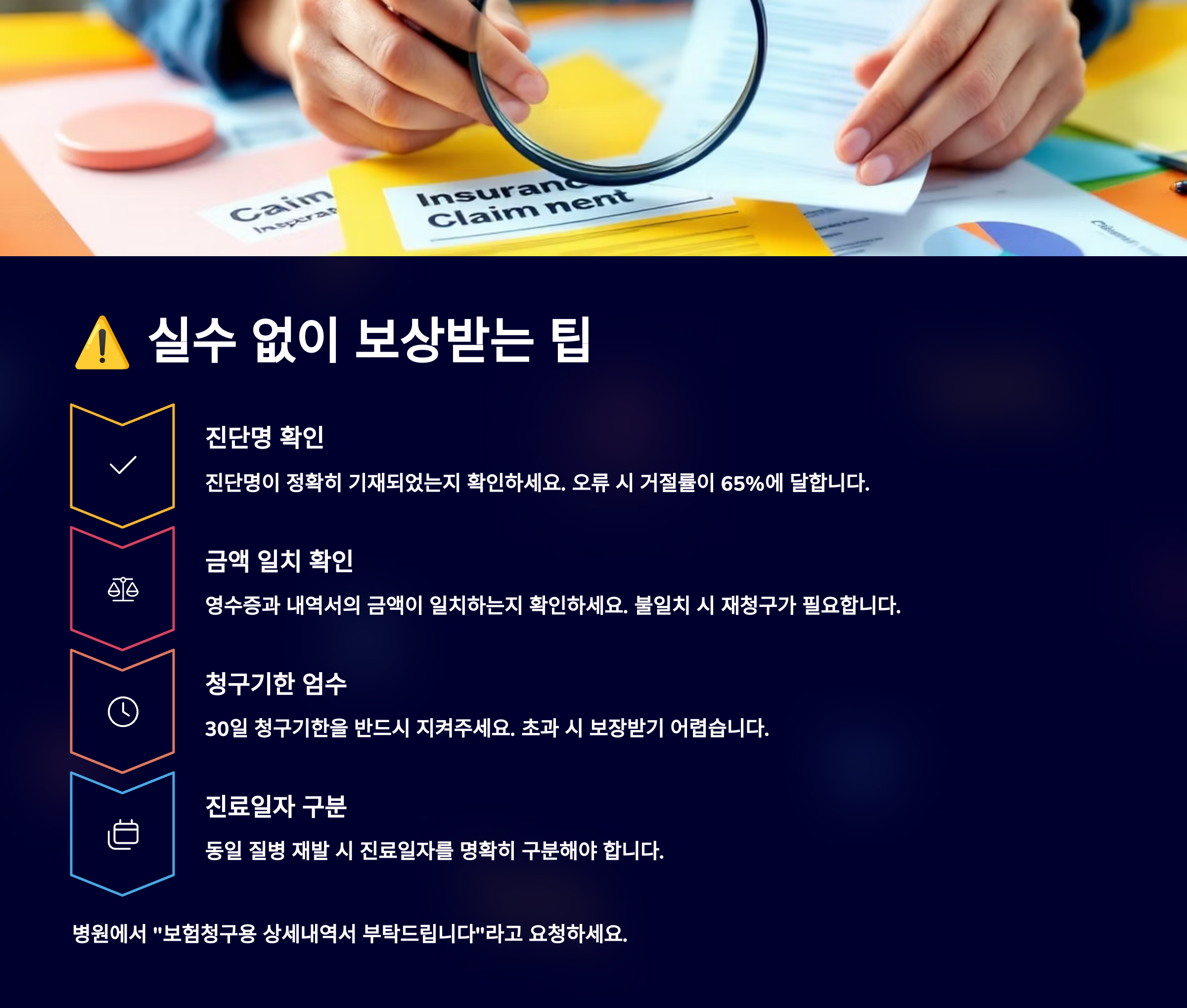 실비 청구는 생각보다 까다로운 절차가 아니지만, 자주 실수하는 몇 가지 포인트만 조심하면 훨씬 더 빠르게 보상받을 수 있어요. 아래 팁들을 꼭 기억해두세요!