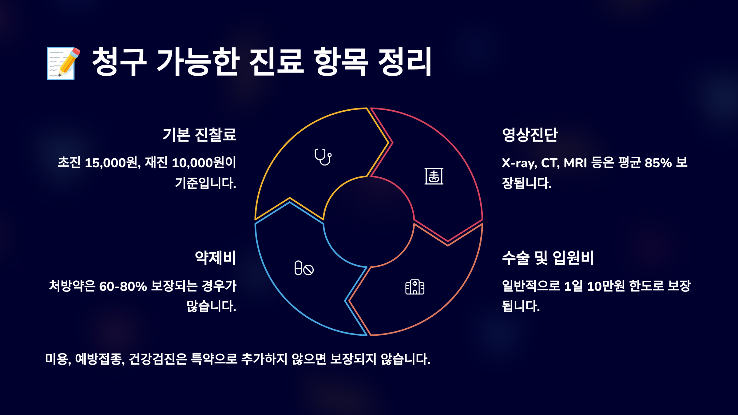 아래는 청구 가능 진료 항목과 비보장 항목을 구분한 요약표예요. 다음 섹션에서는 📄 필수 서류 준비 리스트를 안내해드릴게요!