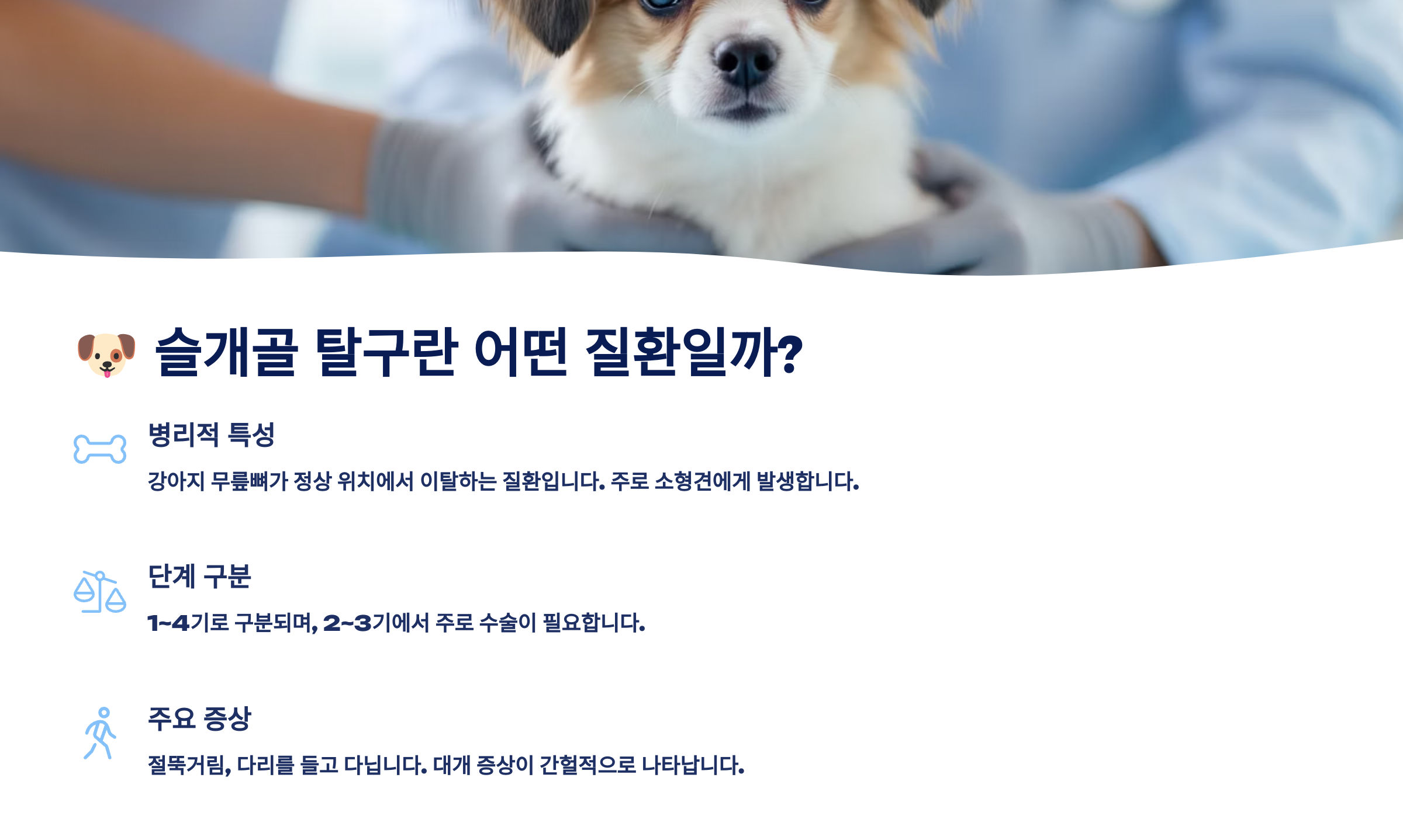 소형견을 키우는 보호자라면 ‘슬개골 탈구’라는 말을 한 번쯤은 들어보셨을 거예요. 무릎뼈가 제자리를 벗어나 통증을 유발하는 질환으로, 초기에는 증상이 미미하다가 점차 악화되어 심하면 걷지 못하거나, 두 다리를 함께 수술해야 할 수도 있답니다. 🐾😢