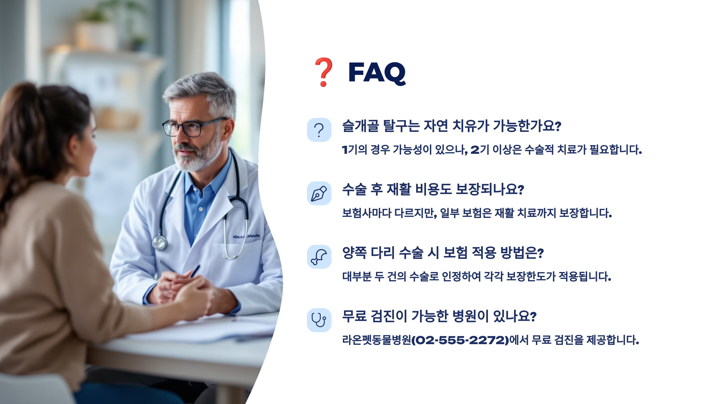 슬개골 탈구는 단순히 걷는 문제가 아니라 아이의 삶의 질 전체에 영향을 주는 질환이에요. 그리고 수술은 비용도 크고 재활까지 길기 때문에, 보험의 도움이 절실한 시점이 많죠. 🩺💸