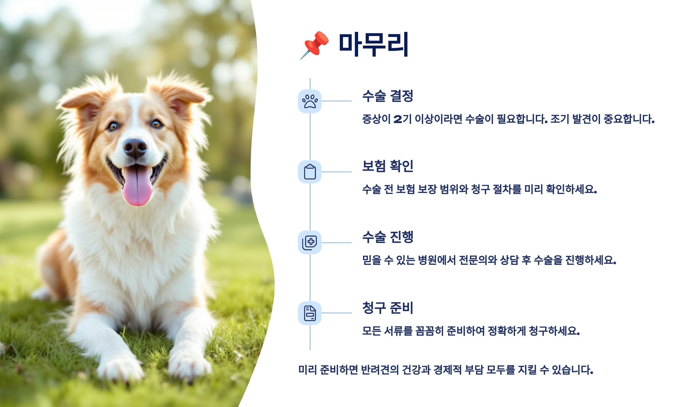 또한 슬개골 수술은 재발률이 높아 보조기 착용, 재활치료 등 추가 비용도 발생할 수 있어요. 보험을 통해 최대한 보장받을 수 있는 구조인지 꼭 확인이 필요해요! 📝